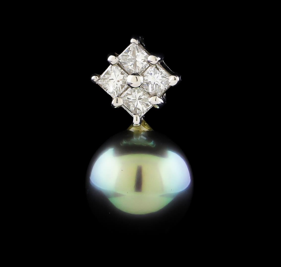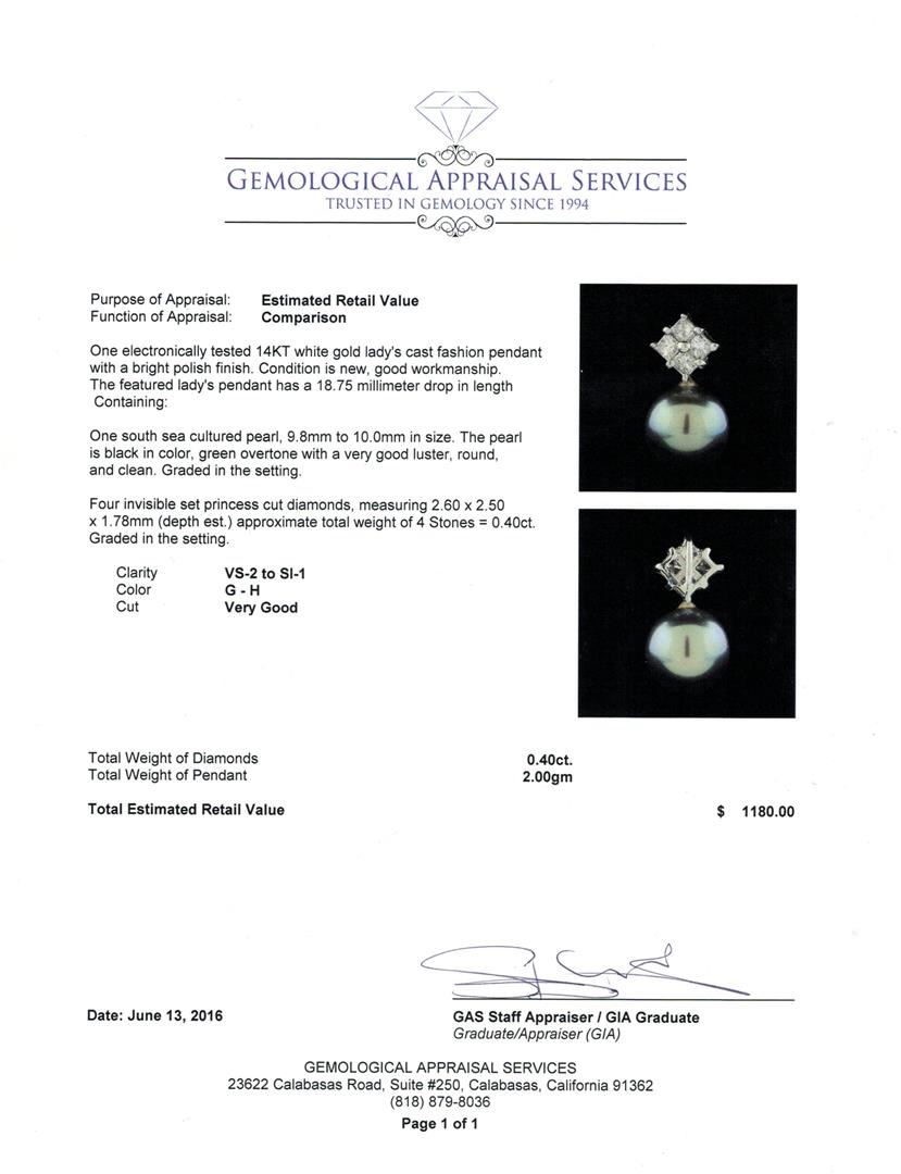 One electronically tested 14KT white gold lady's cast fashion pendant with a bright polish finish. The featured lady's pendant has a 18.75 millimeter drop in length Condition is new, good workmanship. Containing: One south sea cultured pearl, 9.8mm to 10.0mm in size. The pearl is black in color, green overtone with a very good luster, round, and clean. Graded in the setting. Four invisible set princess cut diamonds, measuring 2.60 x 2.50 x 1.78mm (depth est.) approximate total weight of 4 Stones = 0.40ct. Graded in the setting. Clarity: VS-2 to SI-1. Color: G - Very Good. Total Weight of Diamonds 0.40ct. Total Weight of Pendant 2.00gm. GAS Appraised at $1,180.00.
