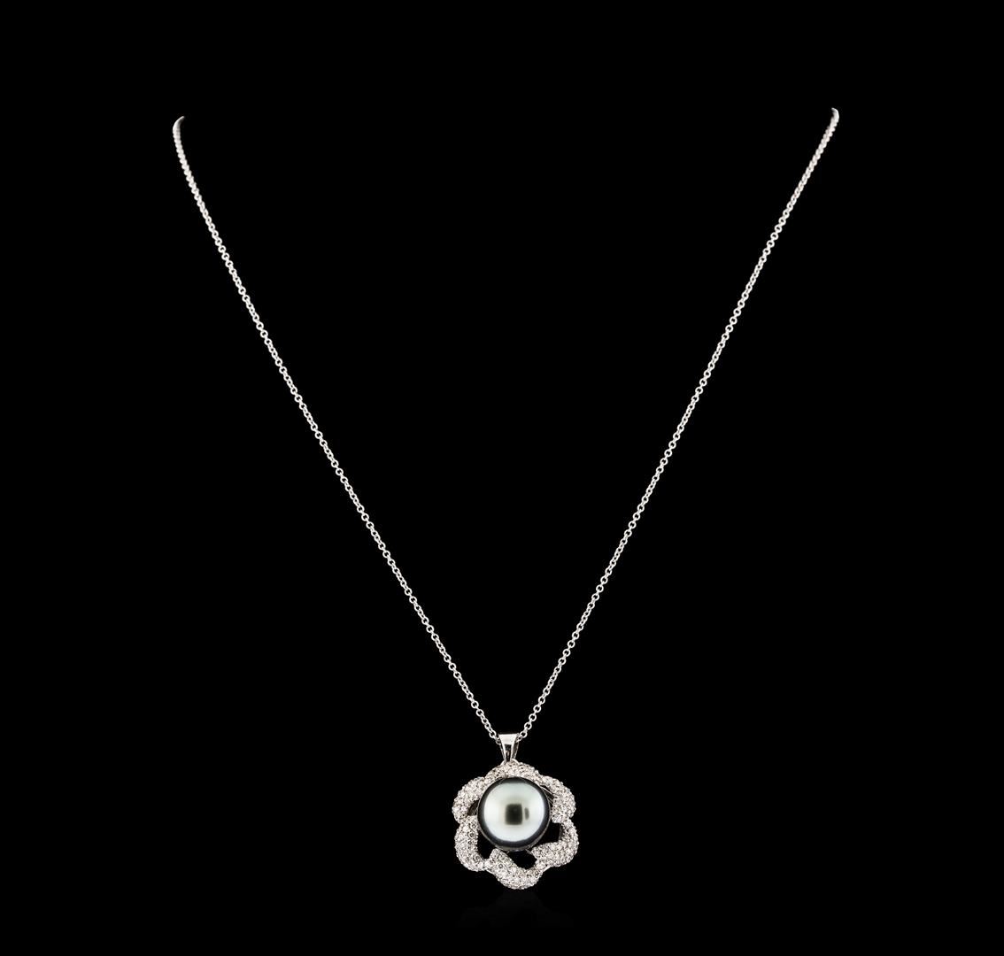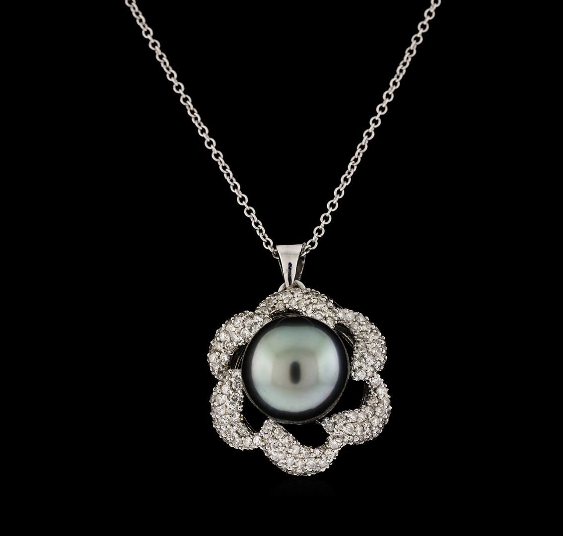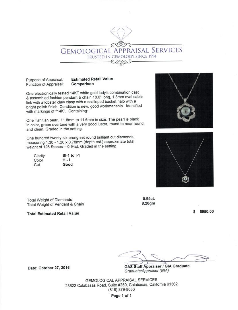 One electronically tested 14KT white gold lady's combination cast & assembled fashion pendant & chain 18.0' long, 1.3mm oval cable link with a lobster claw clasp with a scalloped basket halo with a bright polish finish. Identified with markings of '14K'. Condition is new, good workmanship. Containing: One Tahitian pearl, 11.8mm to 11.6mm in size. The pearl is black in color, green overtone with a very good luster, round to near round, and clean. Graded in the setting. One Hundred Twenty-Six prong set round brilliant cut diamonds, measuring 1.30 - 1.20 x 0.78mm (depth est.) approximate total weight of 126 Stones = 0.94ct. Graded in the setting. Clarity SI-1 to I-1. Color: H - I Cut Good. Total Weight of Diamonds 0.94ct.. Total Weight of Pendant & Chain 8.20gm. GAS Appraised.