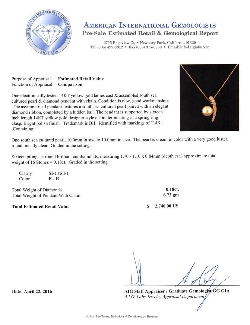 One electronically tested 14KT yellow gold ladies cast & assembled south sea cultured pearl & diamond pendant with chain. The asymmetrical pendant features a south sea cultured pearl paired with an elegant diamond ribbon, completed by a hidden bail. The pendant is supported by sixteen inch length 14KT yellow gold designer style chain, terminating in a spring ring clasp. Bright polish finish. Trademark is BH. Identified with markings of "14K". Condition is new, good workmanship. Containing: One south sea cultured pearl, 10.0mm in size to 10.0mm in size. The pearl is cream in color with a very good luster, round, mostly clean Graded in the setting. South Sea Cultured Pearls are farmed in the ocean waters throughout Australia, the Philippines, Indonesia, and the southern coast of China. Australia's main culturing industry is located near the city of Broome, in the northwest, on the Kimberley coast. South Sea cultured pearls form in the Pinctada Maxima oyster, the world's largest (up to 34cm) pearl cultivating oyster. The Indian & Pacific Ocean, the Java & the South China Sea, are the native waters of the Pinctada Maxima oyster. There are two varieties of the Pinctada Maxima: the Gold Lipped oyster which produces the golden color pearls, and the Silver Lipped oyster which produces white color pearls. The South Sea cultured pearl takes from about two to three years to grow. It is produced by inserting a large bead into the oyster when it is about two years old. The South Sea pearl nacre has a unique satiny appearance, due partly to the fast moving and clean waters on the South Seas. Sixteen prong set round brilliant cut diamonds, measuring 1.70 - 1.10 x 0.84mm (depth est.) approximate total weight of 16 Stones = 0.18ct. Graded in the setting. Clarity: SI-1 to I-1. Color: F - H. Total Weight of Diamonds 0.18ct. Total Weight of Pendant With Chain 6.73gm. AIG Appraised at $2,740.00.