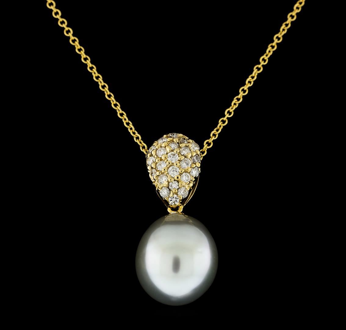 One pendant with chain : 14KT yellow gold weighing 1.87gm containing pearl and diamonds weighing 0.33ctw.