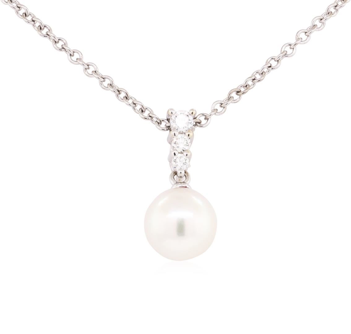 One pendant with chain featuring: 18KT white gold weighing 4.8 grams containing one round pearl and diamonds weighing 0.12ctw. The attached chain is adjustable between sixteen and eighteen inches in length.