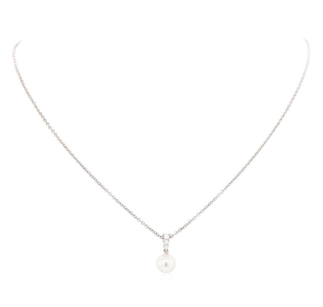 One pendant with chain featuring: 18KT white gold weighing 4.8 grams containing one round pearl and diamonds weighing 0.12ctw. The attached chain is adjustable between sixteen and eighteen inches in length.