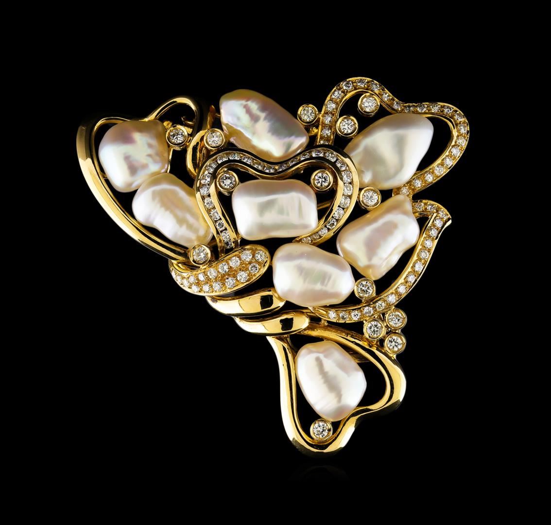 One electronically tested 14KT yellow gold lady's combination cast & assembled freeform fashion pendant-pin with a bright polish finish. Identified with markings of "14K 585". Condition is new, good workmanship. Containing: Eight Chinese freshwater pearls, 11.0mm to 8.0mm in size. The pearls are off white in color with a very good luster, baroque, and lightly blemished with good matching. Graded in the setting. Fourteen bezel set round brilliant cut diamonds, measuring 2.50 - 2.40 x 1.52mm (depth est.) approximate total weight of 14 Stones = 0.80ct. Graded in the setting. Clarity: SI-1 to SI-2. Color: H - I. Cut Good Fifty-Five bead set round brilliant cut diamonds, measuring 1.70 - 1.60 x 1.02mm (depth est.) approximate total weight of 55 Stones = 0.93ct. Graded in the setting. Clarity: VS-2 to SI-1. Color: G - Good Twenty-Six channel set round brilliant cut diamonds, measuring 1.80 - 1.70 x 1.09mm (depth est.) approximate total weight of 26 Stones = 0.53ct. Graded in the setting. Clarity: SI-1 to SI-2. Color: H - I. Cut Good. Total Weight of Diamonds 2.26ct. Total Weight of Pendant-Pin 25.60gm. GAS Appraised at $9,865.00.