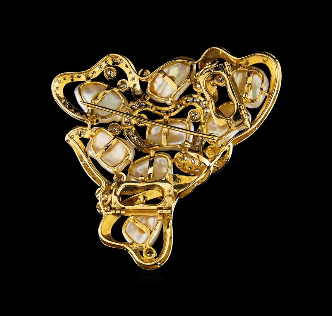 One electronically tested 14KT yellow gold lady's combination cast & assembled freeform fashion pendant-pin with a bright polish finish. Identified with markings of "14K 585". Condition is new, good workmanship. Containing: Eight Chinese freshwater pearls, 11.0mm to 8.0mm in size. The pearls are off white in color with a very good luster, baroque, and lightly blemished with good matching. Graded in the setting. Fourteen bezel set round brilliant cut diamonds, measuring 2.50 - 2.40 x 1.52mm (depth est.) approximate total weight of 14 Stones = 0.80ct. Graded in the setting. Clarity: SI-1 to SI-2. Color: H - I. Cut Good Fifty-Five bead set round brilliant cut diamonds, measuring 1.70 - 1.60 x 1.02mm (depth est.) approximate total weight of 55 Stones = 0.93ct. Graded in the setting. Clarity: VS-2 to SI-1. Color: G - Good Twenty-Six channel set round brilliant cut diamonds, measuring 1.80 - 1.70 x 1.09mm (depth est.) approximate total weight of 26 Stones = 0.53ct. Graded in the setting. Clarity: SI-1 to SI-2. Color: H - I. Cut Good. Total Weight of Diamonds 2.26ct. Total Weight of Pendant-Pin 25.60gm. GAS Appraised at $9,865.00.