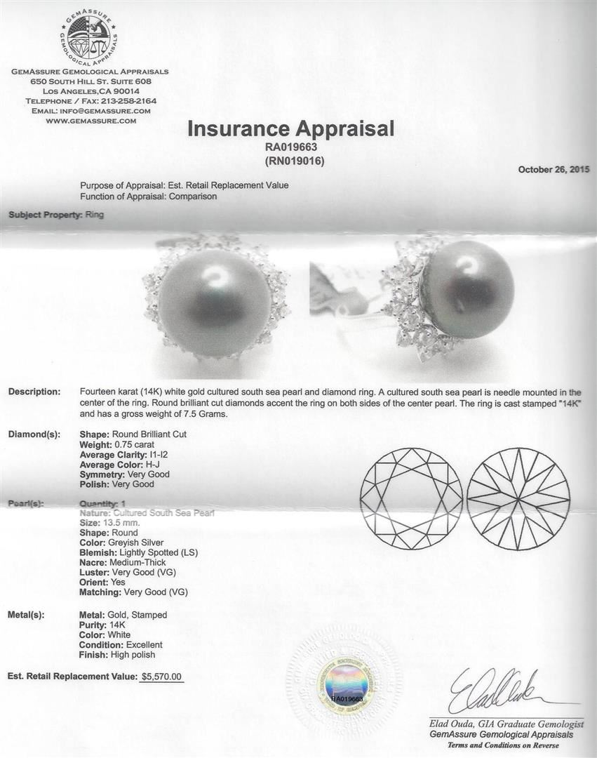 Fourteen karat (14K) white gold cultured south sea pearl and diamond ring. A cultured south sea pearl is needle mounted in the center of the ring. Round brilliant cut diamonds accent the ring on both sides of the center pearl. The ring is cast stamped "14 GGA Appraised.