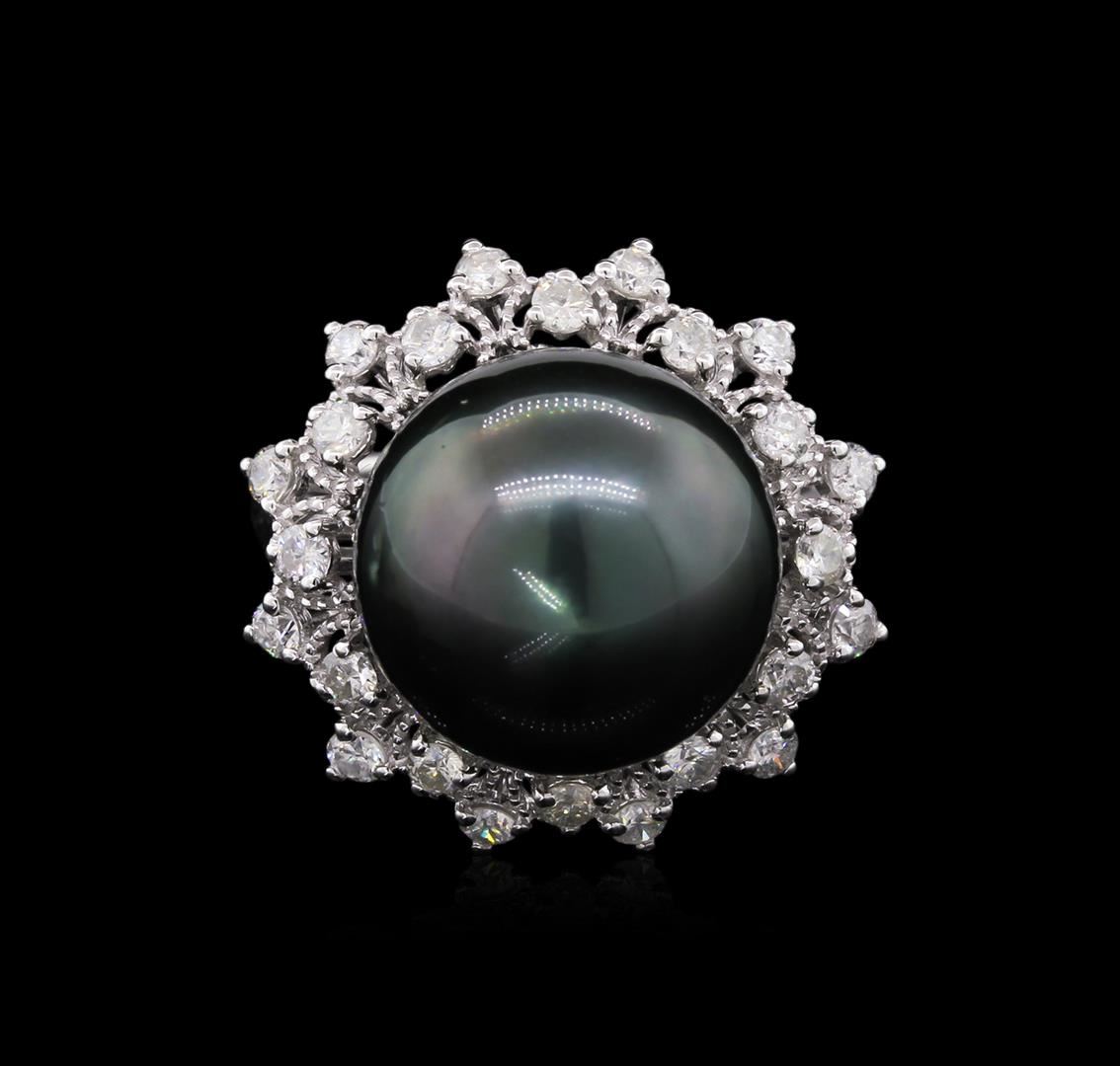 Fourteen karat (14K) white gold cultured south sea pearl and diamond ring. A cultured south sea pearl is needle mounted in the center of the ring. Round brilliant cut diamonds accent the ring on both sides of the center pearl. The ring is cast stamped "14K" and has a gross weight of 7.5 Grams. Diamond(s): Shape: Round Brilliant Cut. Weight: 0.75 carat. Average Clarity: I1-I2. Average Color: H-J. Symmetry: Very Good. Polish: Very Good. Pearl(s): Quantity: 1. Nature: Cultured South Sea Pearl. Size: 13.5 mm. Shape: Round. Color: Greyish Silver. Blemish: Lightly Spotted (LS). Nacre: Medium-Thick. Luster: Very Good (VG). Orient: Yes. Matching: Very Good (VG). Metal(s): Metal: Gold, Stamped. Purity: 14K. Color: White. Condition: Excellent. Finish: High polish. GGA Appraised.