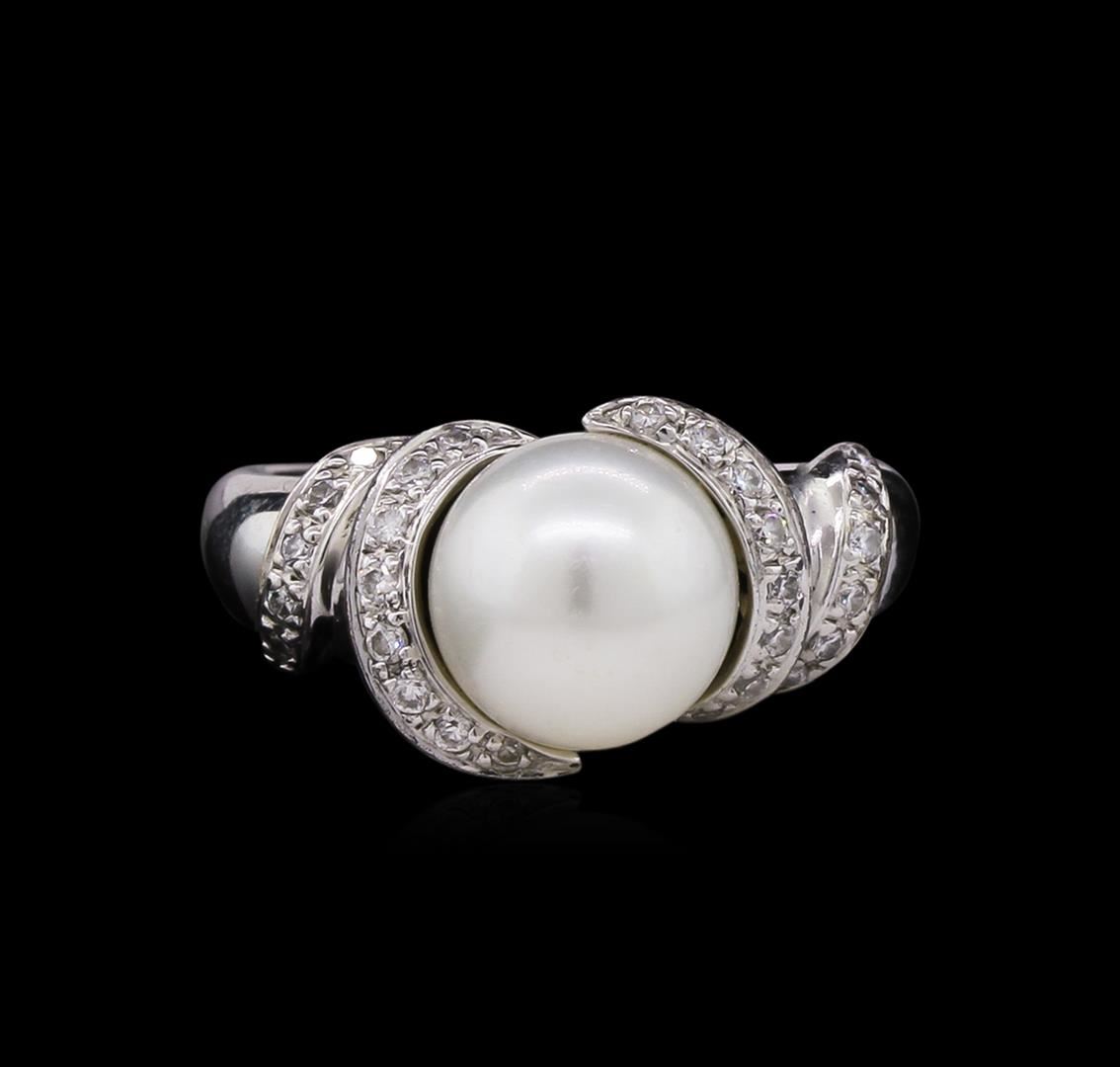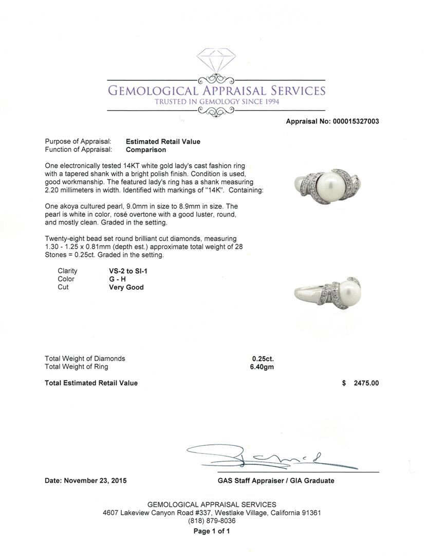 One electronically tested 14KT white gold lady's cast fashion ring with a tapered shank with a bright polish finish. The featured lady's ring has a shank measuring 2.20 millimeters in width. Identified with markings of "14K". Condition is used, good workmanship. Containing: One akoya cultured pearl, 9.0mm in size to 8.9mm in size. The pearl is white in color, rosé overtone with a good luster, round, and mostly clean. Graded in the setting. Twenty-Eight bead set round brilliant cut diamonds, measuring 1.30 - 1.25 x 0.81mm (depth est.) approximate total weight of 28 Stones = 0.25ct. Graded in the setting. Clarity: VS-2 to SI-1. Color: G - Very Good. Total Weight of Diamonds 0.25ct. Total Weight of Ring 6.40gm. GAS Appraised at $2,475.00.