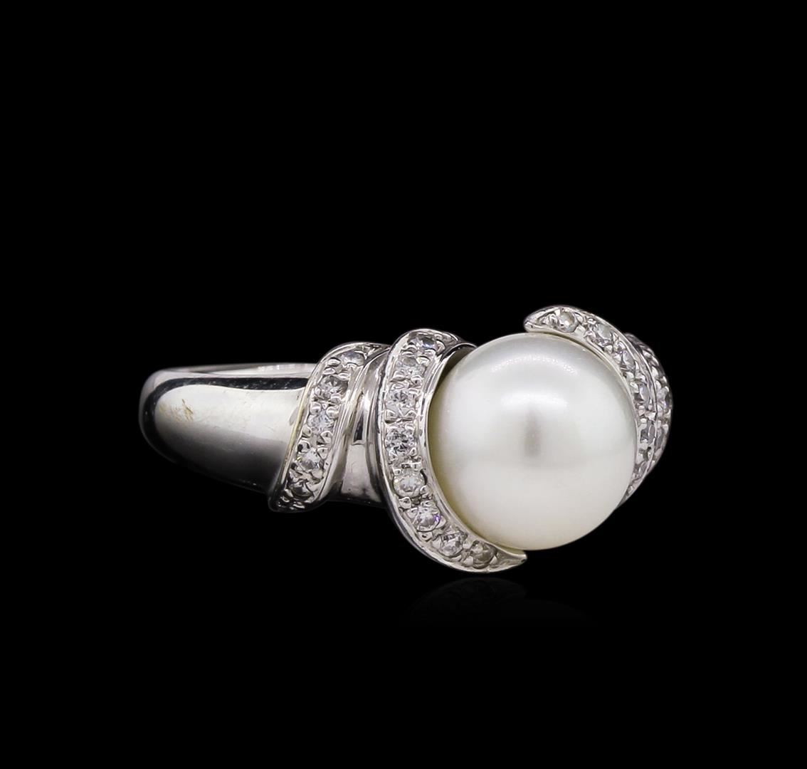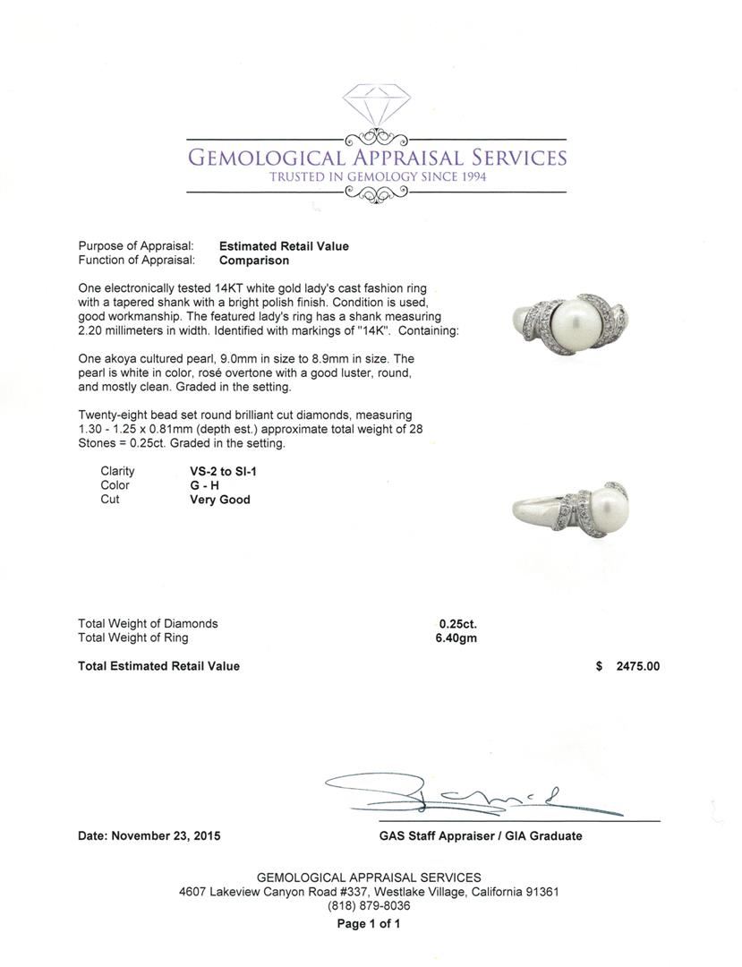 One electronically tested 14KT white gold lady's cast fashion ring with a tapered shank with a bright polish finish. The featured lady's ring has a shank measuring 2.20 millimeters in width. Identified with markings of "14K". Condition is used, good workmanship. Containing: One akoya cultured pearl, 9.0mm in size to 8.9mm in size. The pearl is white in color, rosé overtone with a good luster, round, and mostly clean. Graded in the setting. Twenty-Eight bead set round brilliant cut diamonds, measuring 1.30 - 1.25 x 0.81mm (depth est.) approximate total weight of 28 Stones = 0.25ct. Graded in the setting. Clarity: VS-2 to SI-1. Color: G - Very Good. Total Weight of Diamonds 0.25ct. Total Weight of Ring 6.40gm. GAS Appraised at $2,475.00.