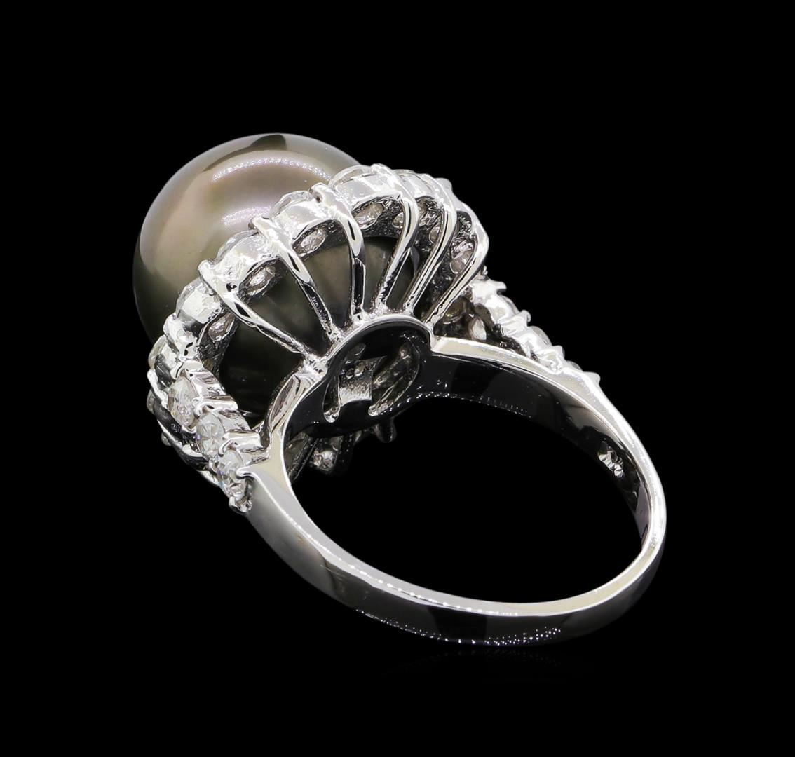 One electronically tested 14KT white gold ladies cast Tahitian cultured pearl & diamond ring with a bright polish finish. The featured Tahitian cultured pearl is set within a diamond bezel supported by diamond set shoulders, completed by a two millimeter wide band. Trademark is USA SG. Identified with markings of "K14". Condition is new, good workmanship. Containing: One Tahitian cultured pearl, 12.5mm in size. The pearl is black in color with a very good luster, round, mostly clean Graded in the setting. Tahitian cultured pearls form in the large "Black Lipped" Pinctada Margaritifera oyster, which is about twice the size of the Japanese Akoya oyster. This warm water species from across the central and South Pacific Ocean is at home in the bays and lagoons of the islands & atolls of French Polynesia. Tahitian cultured pearl farmers generally raise their oysters in lagoons. Tahitian cultured pearls take from two to four years to form. Black pearls are known for their iridescent, vibrant, almost metallic natural colors, unique among saltwater cultured pearls. Though commonly called "Tahitian" pearls, they are actually gray, to a lighter or darker degree. Tahitian pearls have the unique ability to display a variety of colors at the same time, which can be seen glistening on their surface. Twenty-Two prong set round brilliant cut diamonds approximate total weight of 22 Stones = 1.54ct. Graded in the setting. Clarity: I-1 to I-3. Color: G - I. Total Weight of Diamonds 1.54ct. Total Weight of Ring 8.21gm. AIG Appraised at $5,585.00.