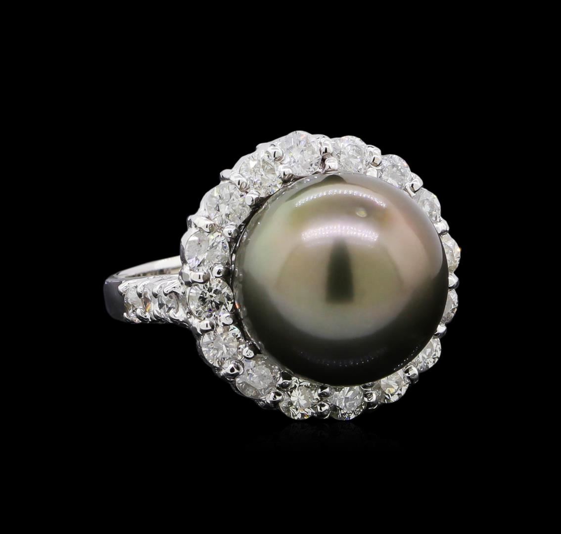 One electronically tested 14KT white gold ladies cast Tahitian cultured pearl & diamond ring with a bright polish finish. The featured Tahitian cultured pearl is set within a diamond bezel supported by diamond set shoulders, completed by a two millimeter wide band. Trademark is USA SG. Identified with markings of "K14". Condition is new, good workmanship. Containing: One Tahitian cultured pearl, 12.5mm in size. The pearl is black in color with a very good luster, round, mostly clean Graded in the setting. Tahitian cultured pearls form in the large "Black Lipped" Pinctada Margaritifera oyster, which is about twice the size of the Japanese Akoya oyster. This warm water species from across the central and South Pacific Ocean is at home in the bays and lagoons of the islands & atolls of French Polynesia. Tahitian cultured pearl farmers generally raise their oysters in lagoons. Tahitian cultured pearls take from two to four years to form. Black pearls are known for their iridescent, vibrant, almost metallic natural colors, unique among saltwater cultured pearls. Though commonly called "Tahitian" pearls, they are actually gray, to a lighter or darker degree. Tahitian pearls have the unique ability to display a variety of colors at the same time, which can be seen glistening on their surface. Twenty-Two prong set round brilliant cut diamonds approximate total weight of 22 Stones = 1.54ct. Graded in the setting. Clarity: I-1 to I-3. Color: G - I. Total Weight of Diamonds 1.54ct. Total Weight of Ring 8.21gm. AIG Appraised at $5,585.00.