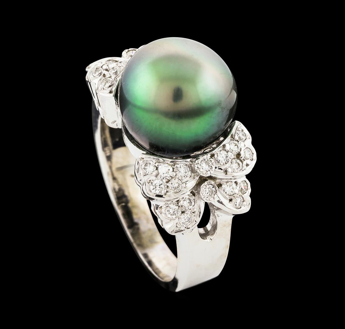 One ring : 14KT white gold weighing 7.23gm containing one pearl with side diamonds weighing 0.36ctw.