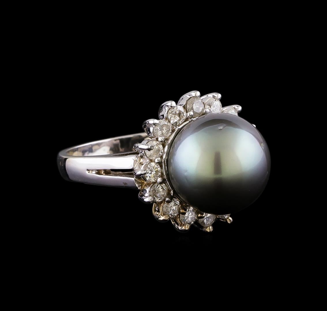 One electronically tested 14KT white gold ladies cast & assembled Tahitian cultured pearl & diamond ring with a bright polish finish. The featured Tahitian cultured pearl is set within a diamond floret bezel supported by a ribbed under gallery and split shoulders, completed by a two millimeter wide band. Trademark is USA SG. Identified with markings of "K14". Condition is new, good workmanship. Containing: One Tahitian cultured pearl, 11.0mm in size. The pearl is black in color with a very good luster, round, mostly clean Graded in the setting. Tahitian cultured pearls form in the large "Black Lipped" Pinctada Margaritifera oyster, which is about twice the size of the Japanese Akoya oyster. This warm water species from across the central and South Pacific Ocean is at home in the bays and lagoons of the islands & atolls of French Polynesia. Tahitian cultured pearl farmers generally raise their oysters in lagoons. Tahitian cultured pearls take from two to four years to form. Black pearls are known for their iridescent, vibrant, almost metallic natural colors, unique among saltwater cultured pearls. Though commonly called "Tahitian" pearls, they are actually gray, to a lighter or darker degree. Tahitian pearls have the unique ability to display a variety of colors at the same time, which can be seen glistening on their surface. Sixteen prong set round brilliant cut diamonds approximate total weight of 16 Stones = 0.64ct. Graded in the setting. Clarity: I-1 to I-2. Color: G - H. Total Weight of Diamonds 0.64ct. Total Weight of Ring 7.29gm. AIG Appraised at $3,350.00.