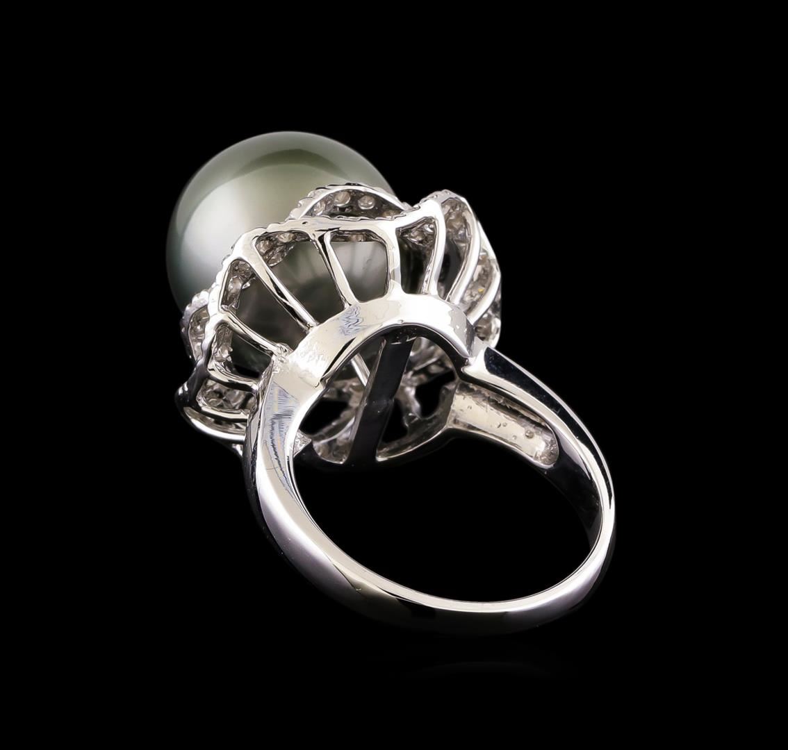 One electronically tested 14KT white gold ladies cast & assembled Tahitian cultured pearl & diamond ring with a bright polish finish. The featured Tahitian cultured pearl is set within stylized diamond bezels supported by a lattice under gallery and tapering shoulders, completed by a two millimeter wide band. Identified with markings of "K14". Condition is new, good workmanship. Containing: One Tahitian cultured pearl, 14.0mm in size. The pearl is black in color with a very good luster, round, clean Graded in the setting. Tahitian cultured pearls form in the large "Black Lipped" Pinctada Margaritifera oyster, which is about twice the size of the Japanese Akoya oyster. This warm water species from across the central and South Pacific Ocean is at home in the bays and lagoons of the islands & atolls of French Polynesia. Tahitian cultured pearl farmers generally raise their oysters in lagoons. Tahitian cultured pearls take from two to four years to form. Black pearls are known for their iridescent, vibrant, almost metallic natural colors, unique among saltwater cultured pearls. Though commonly called "Tahitian" pearls, they are actually gray, to a lighter or darker degree. Tahitian pearls have the unique ability to display a variety of colors at the same time, which can be seen glistening on their surface. Sixty-One prong set round brilliant cut diamonds approximate total weight of 61 Stones = 0.82ct. Graded in the setting. Clarity: I-1 to I-2. Color: F - H. Total Weight of Diamonds 0.82ct. Total Weight of Ring 10.98gm. AIG Appraised at $5,940.00.
