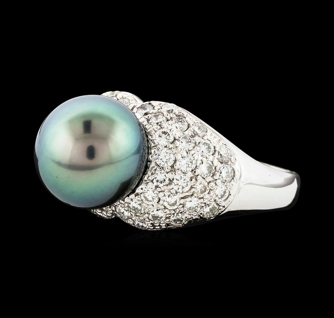 One electronically tested 14KT white gold lady's cast fashion ring with a bright polish finish. The featured lady's ring has a shank measuring 3.09 millimeters wide. Identified with markings of 'K14'. Condition is new, good workmanship. Containing: One Tahitian pearl, 10.2mm to 9.9mm in size. The pearl is black in color, green overtone with a very good luster, round to near round, and clean. Graded in the setting. Forty-Eight prong set round brilliant cut diamonds, measuring 1.85 - 1.75 x 1.10mm (depth est.) approximate total weight of 48 Stones = 1.04ct. Graded in the setting. Clarity SI-1 to SI-2. Color: H - I Cut Good Four prong set round brilliant cut diamonds, measuring 1.60 - 1.55 x 0.98mm (depth est.) approximate total weight of 4 Stones = 0.06ct. Graded in the setting. Clarity SI-1 to SI-2. Color: H - I Cut Good. Total Weight of Diamonds 1.10ct.. Total Weight of Ring 7.10gm. GAS Appraised at $4,935.00.