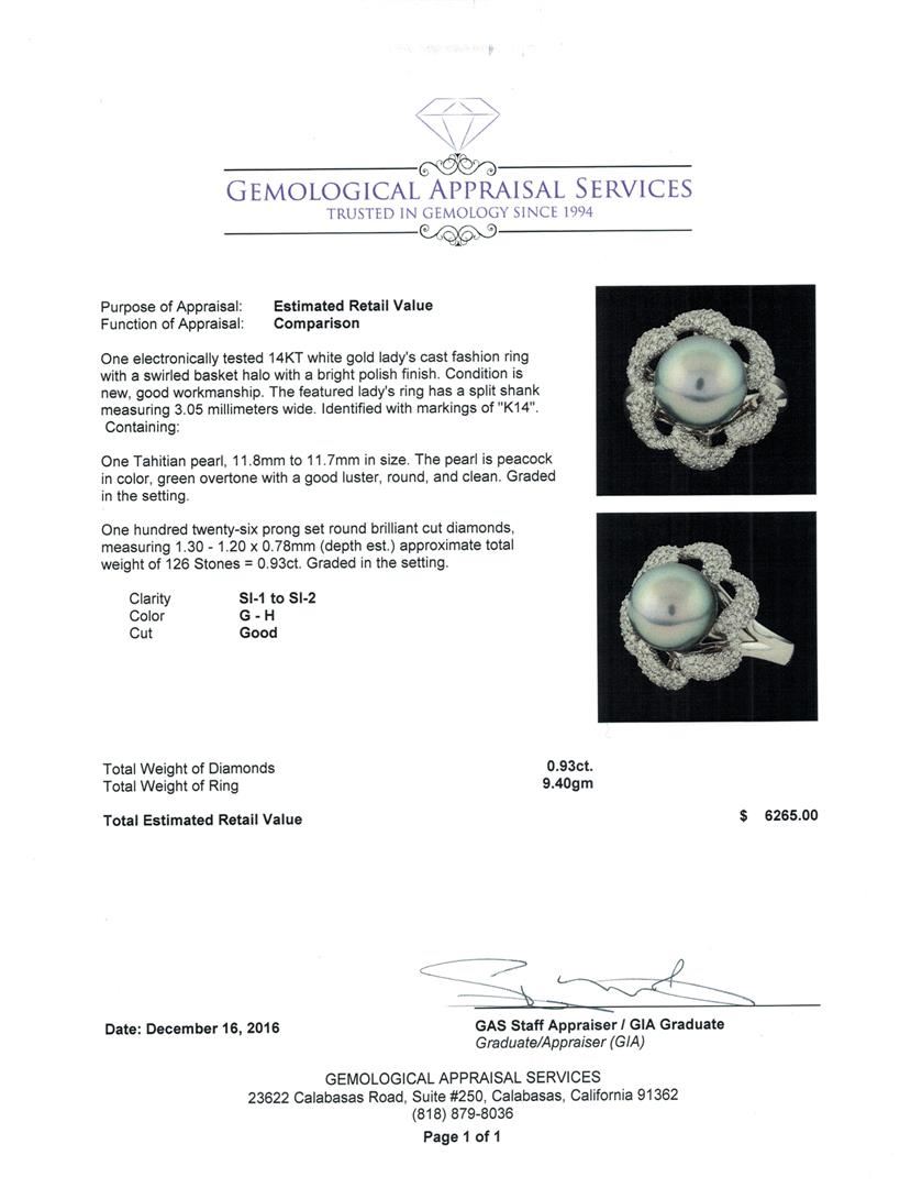 One electronically tested 14KT white gold lady's cast fashion ring with a swirled basket halo with a bright polish finish. The featured lady's ring has a split shank measuring 3.05 millimeters wide. Identified with markings of 'K14'. Condition is new, good workmanship. Containing: One Tahitian pearl, 11.8mm to 11.7mm in size. The pearl is peacock in color, green overtone with a good luster, round, and clean. Graded in the setting. One Hundred Twenty-Six prong set round brilliant cut diamonds, measuring 1.30 - 1.20 x 0.78mm (depth est.) approximate total weight of 126 Stones = 0.93ct. Graded in the setting. Clarity SI-1 to SI-2. Color: G - H Cut Good. Total Weight of Diamonds 0.93ct.. Total Weight of Ring 9.40gm. GAS Appraised at $6,265.00.