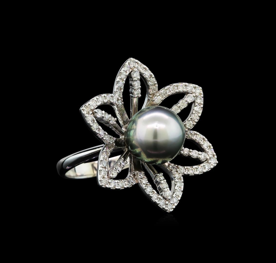 One electronically tested 14KT white gold lady's cast flower design ring with a bright polish finish. The featured lady's ring has a shank measuring 2.81 millimeters wide. Identified with markings of '585'. Condition is new, good workmanship. Containing: One Tahitian pearl, 10.3mm to 10.2mm in size. The pearl is peacock in color, green overtone with a very good luster, round to near round, and mostly clean. Graded in the setting. Seventy-Eight prong set round brilliant cut diamonds, measuring 1.45 - 1.35 x 0.87mm (depth est.) approximate total weight of 78 Stones = 0.81ct. Graded in the setting. Clarity SI-1 to I-1. Color: G - H Cut Good. Total Weight of Diamonds 0.81ct.. Total Weight of Ring 8.40gm. GAS Appraised.