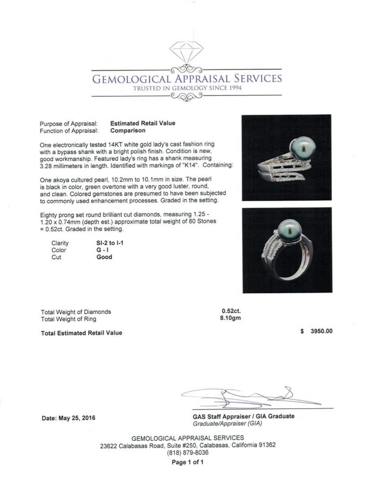 One electronically tested 14KT white gold lady's cast fashion ring with a bypass shank with a bright polish finish. Featured lady's ring has a shank measuring 3.28 millimeters in length. Identified with markings of "K14". Condition is new, good workmanship. Containing: One akoya cultured pearl, 10.2mm to 10.1mm in size. The pearl is black in color, green overtone with a very good luster, round, and clean. Colored gemstones are presumed to have been subjected to commonly used enhancement processes. Graded in the setting. Eighty prong set round brilliant cut diamonds, measuring 1.25 - 1.20 x 0.74mm (depth est.) approximate total weight of 80 Stones = 0.52ct. Graded in the setting. Clarity: SI-2 to I-1. Color: G - I. Cut Good. Total Weight of Diamonds 0.52ct. Total Weight of Ring 8.10gm. GAS Appraised.