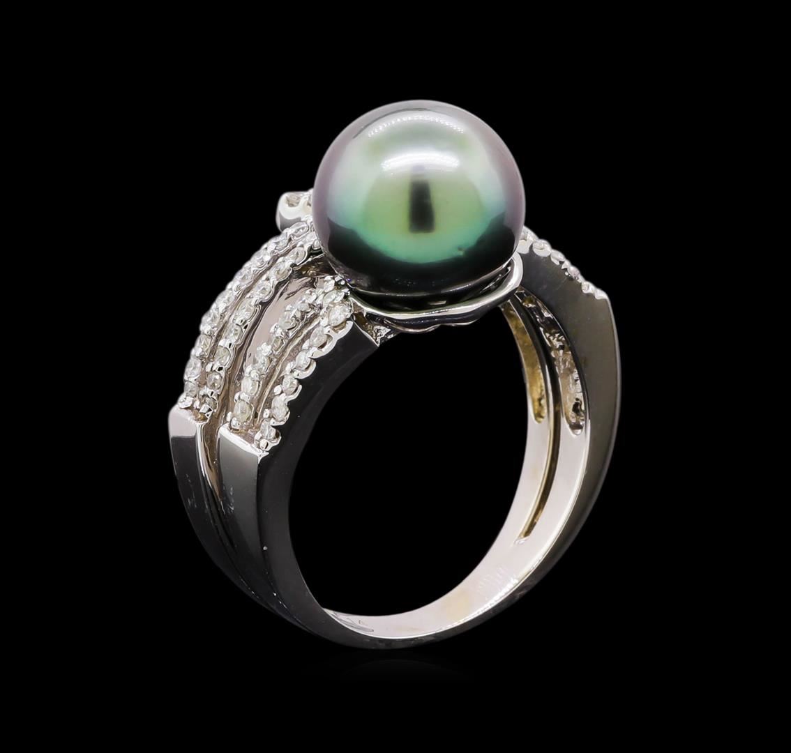 One electronically tested 14KT white gold lady's cast fashion ring with a bypass shank with a bright polish finish. Featured lady's ring has a shank measuring 3.28 millimeters in length. Identified with markings of "K14". Condition is new, good workmanship. Containing: One akoya cultured pearl, 10.2mm to 10.1mm in size. The pearl is black in color, green overtone with a very good luster, round, and clean. Colored gemstones are presumed to have been subjected to commonly used enhancement processes. Graded in the setting. Eighty prong set round brilliant cut diamonds, measuring 1.25 - 1.20 x 0.74mm (depth est.) approximate total weight of 80 Stones = 0.52ct. Graded in the setting. Clarity: SI-2 to I-1. Color: G - I. Cut Good. Total Weight of Diamonds 0.52ct. Total Weight of Ring 8.10gm. GAS Appraised.