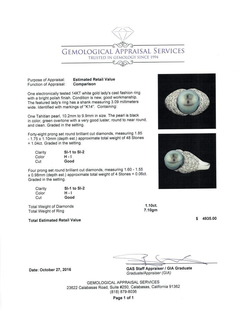 One electronically tested 14KT white gold lady's cast fashion ring with a bright polish finish. The featured lady's ring has a shank measuring 3.09 millimeters wide. Identified with markings of 'K14'. Condition is new, good workmanship. Containing: One Tahitian pearl, 10.2mm to 9.9mm in size. The pearl is black in color, green overtone with a very good luster, round to near round, and clean. Graded in the setting. Forty-Eight prong set round brilliant cut diamonds, measuring 1.85 - 1.75 x 1.10mm (depth est.) approximate total weight of 48 Stones = 1.04ct. Graded in the setting. Clarity SI-1 to SI-2. Color: H - I Cut Good Four prong set round brilliant cut diamonds, measuring 1.60 - 1.55 x 0.98mm (depth est.) approximate total weight of 4 Stones = 0.06ct. Graded in the setting. Clarity SI-1 to SI-2. Color: H - I Cut Good. Total Weight of Diamonds 1.10 ct.. Total Weight of Ring 7.10gm. GAS Appraised.
