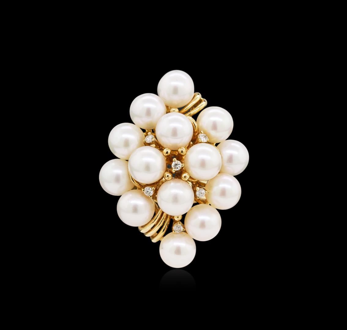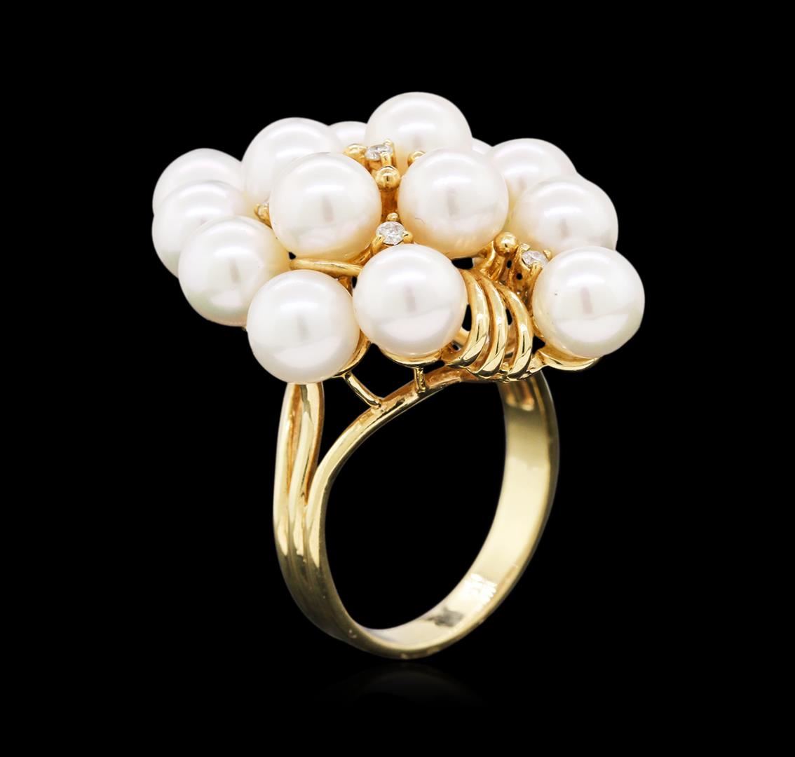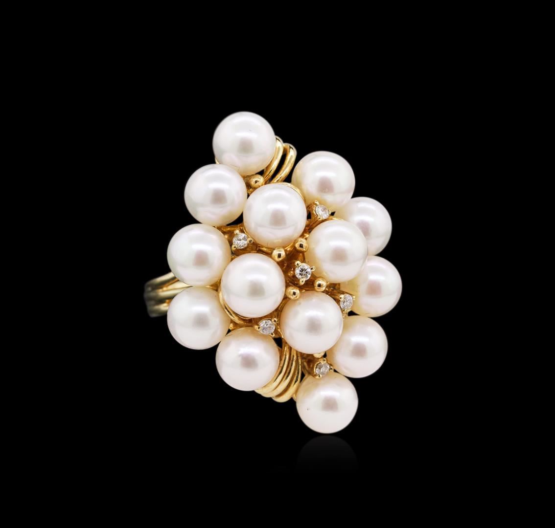 Pearl and Diamond Ring - 14KT Yellow Gold. 11.40 g total weight; 6 diamonds; .01 pt each = .06 total diamond weight; 14 pearls; .5 ct each; Size 7.5.