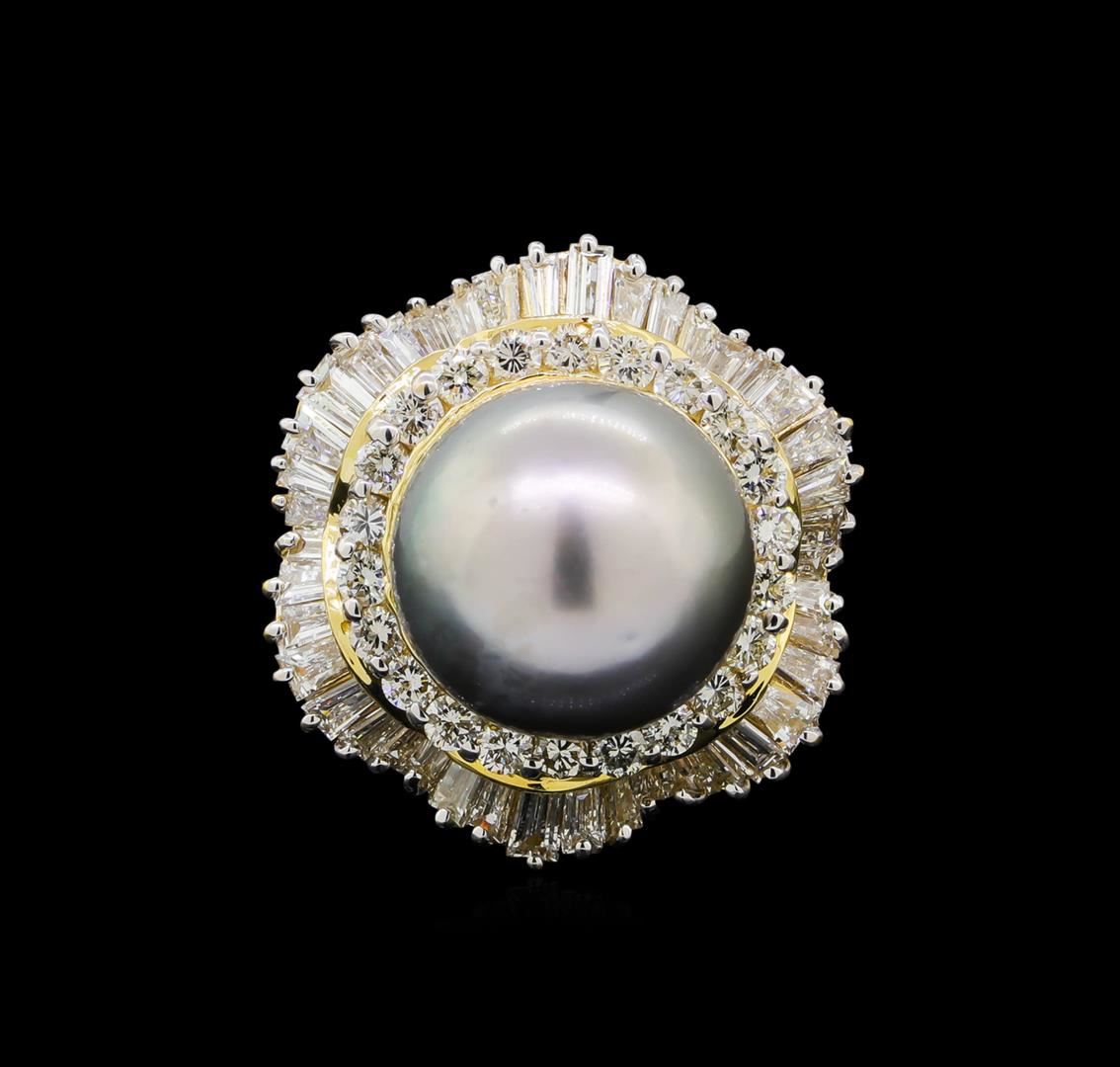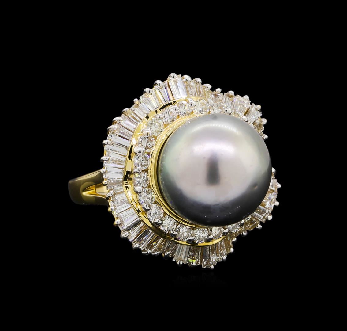 One electronically tested 14KT yellow gold lady's cast fashion ring with a double basket halo with a bright polish finish. The featured lady's ring has a shank measuring 3.02 millimeters in width. Identified with markings of "14K". Condition is new, good workmanship. Containing: Twenty-Two prong set round brilliant cut diamonds, measuring 2.10 - 2.00 x 1.27mm (depth est.) approximate total weight of 22 Stones = 0.75ct. Graded in the setting. Clarity: VS-2 to SI-1. Color: H - I. Cut Good Forty-Two prong set baguette cut (tapered) diamonds, measuring from 1.80 x 1.50 x 1.28mm (depth est.) to 2.60 x 1.90 x 1.62mm (depth est.) approximate total weight of 42 Stones = 2.05ct. Graded in the setting. Clarity: VS-2 to SI-1. Color: G - I. Cut Very Good One south sea cultured pearl, 13.6mm to 13.4mm in size. The pearl is black in color, faint green overtone with a good luster, near round, and mostly clean. Graded in the setting. Total Weight of Diamonds 2.80ct. Total Weight of Ring 14.00gm. GAS Appraised at $10,850.00.