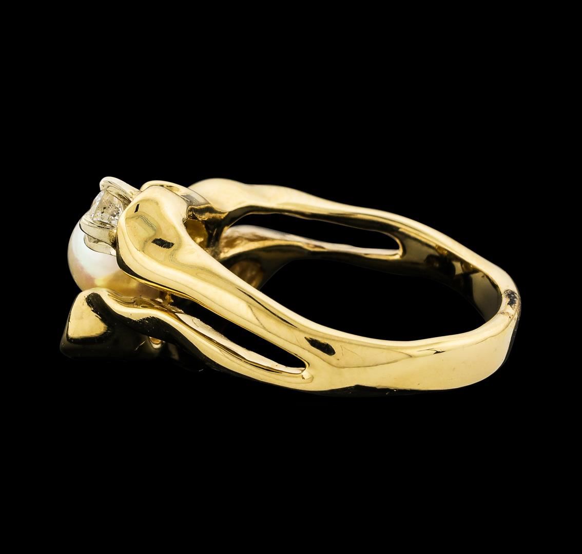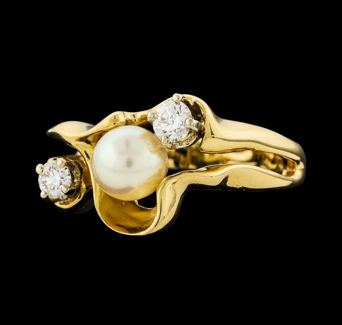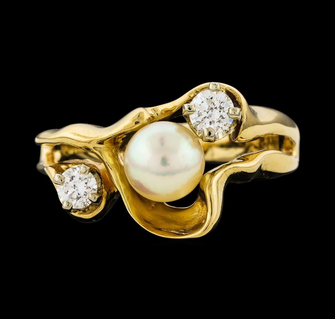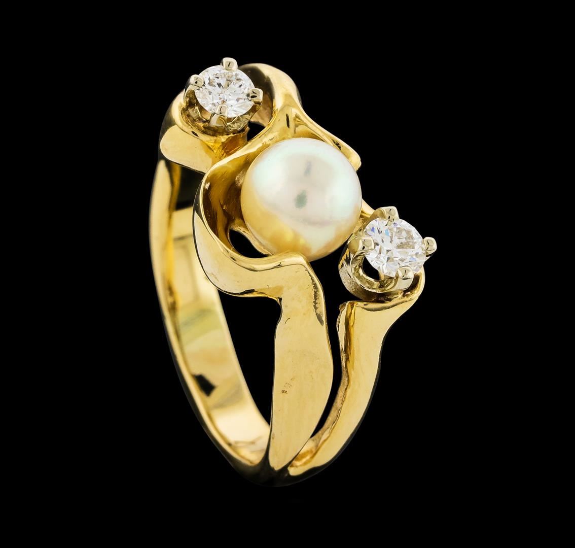 One Pearl and Diamond Ring featuring: 14KT Yellow Gold with a total weight of 6.3 grams and diamonds with a total weight of 0.50ctw.