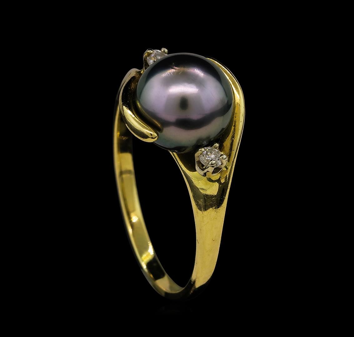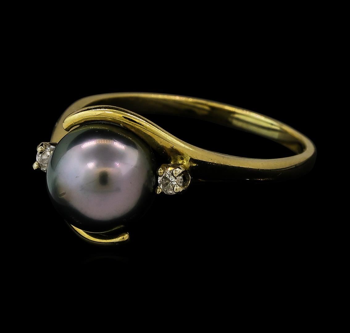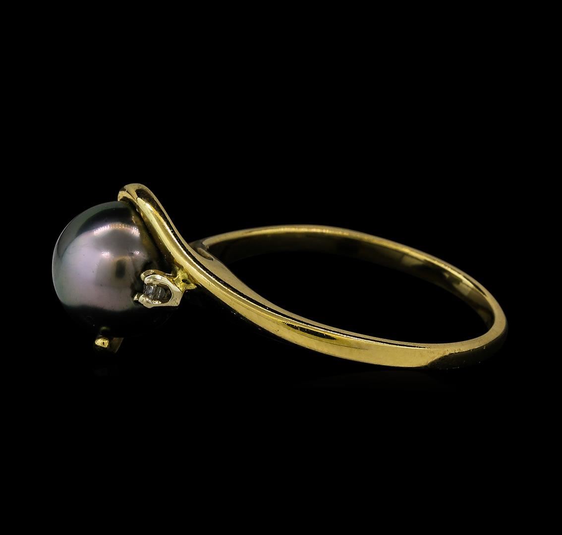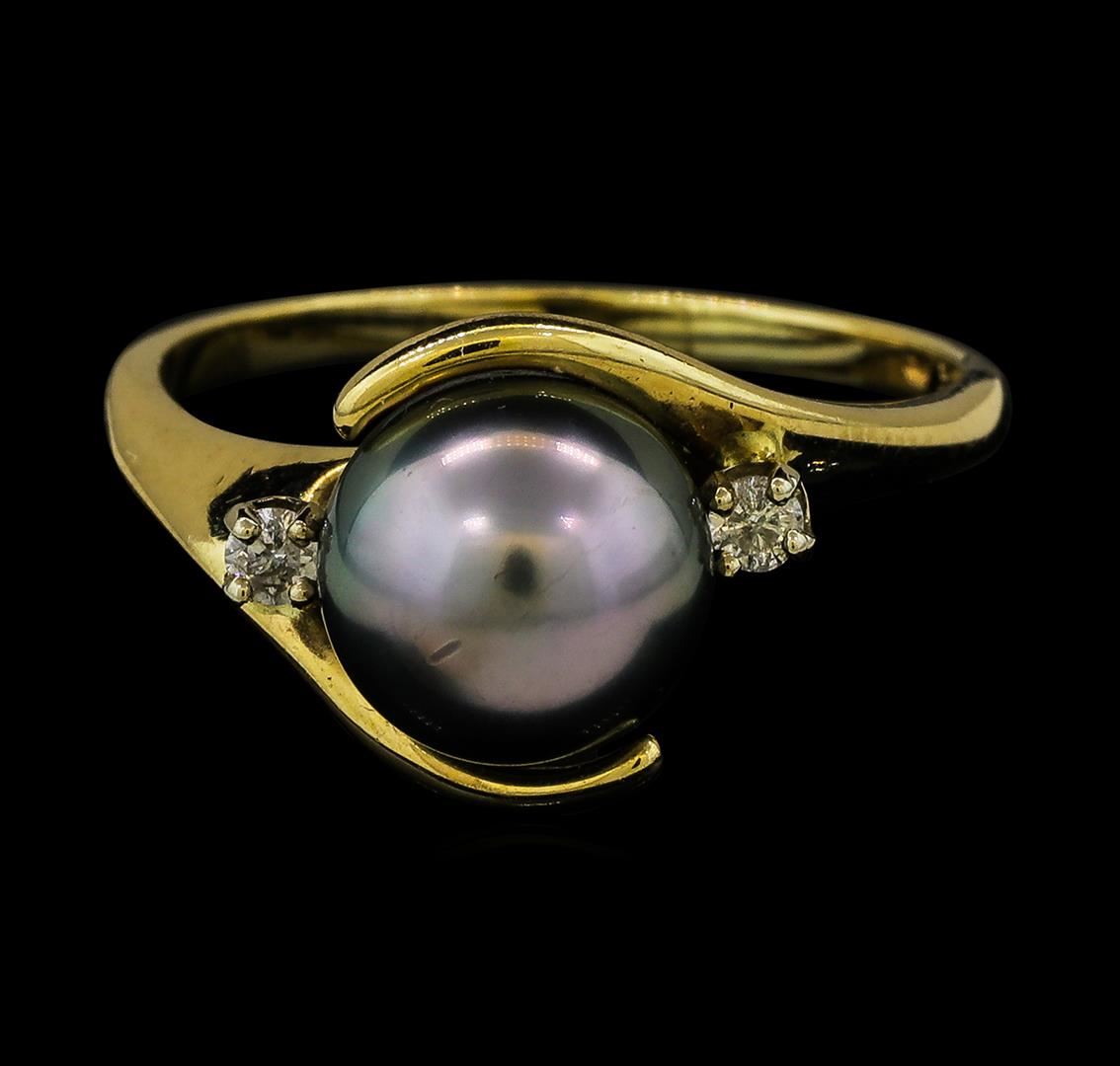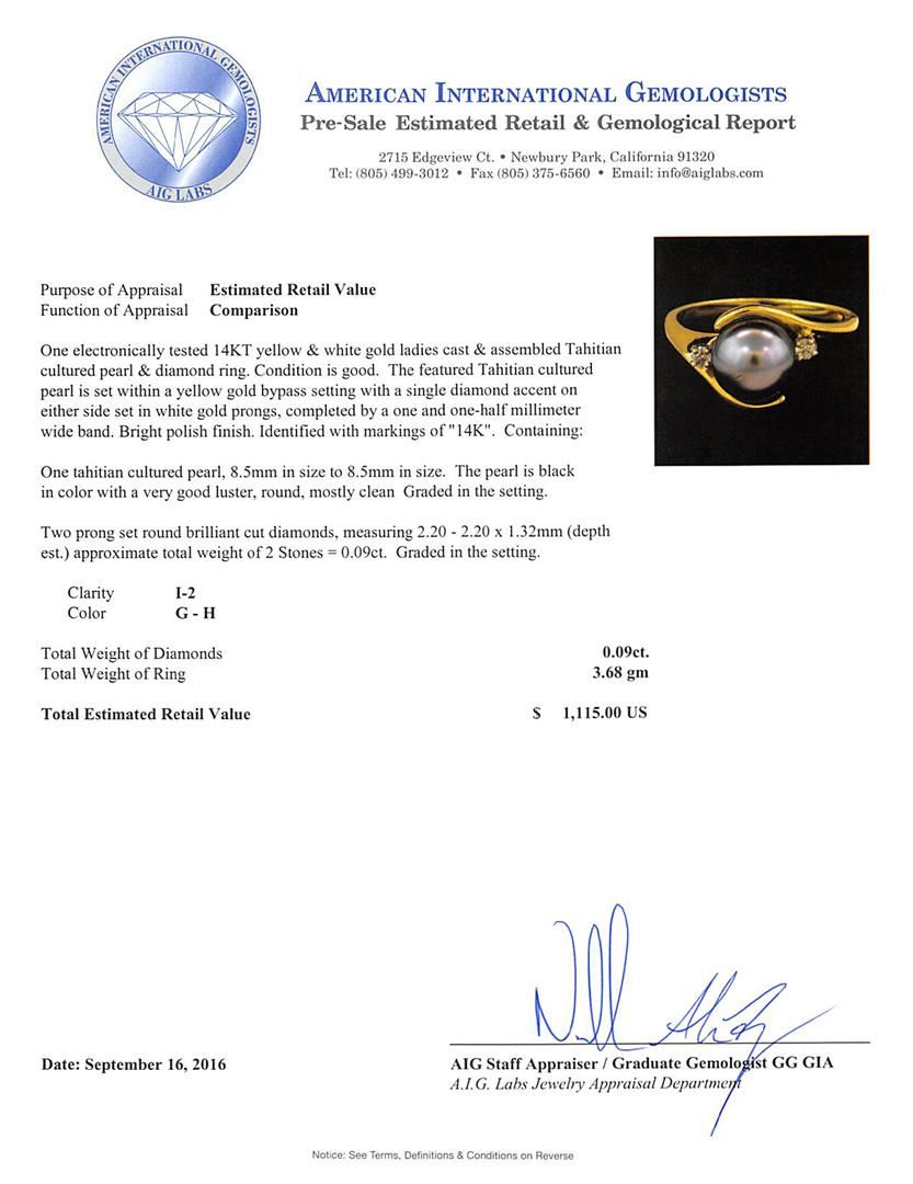 One electronically tested 14KT yellow & white gold ladies cast & assembled Tahitian cultured pearl & diamond ring. The featured Tahitian cultured pearl is set within a yellow gold bypass setting with a single diamond accent on either side set in white gold prongs, completed by a one and one-half millimeter wide band. Bright polish finish. Identified with markings of '14K'. Condition is good. Containing: One tahitian cultured pearl, 8.5mm in size to 8.5mm in size. The pearl is black in color with a very good luster, round, mostly clean Graded in the setting. Two prong set round brilliant cut diamonds, measuring 2.20 - 2.20 x 1.32mm (depth est.) approximate total weight of 2 Stones = 0.09ct. Graded in the setting. Clarity I-2. Color: G - H. Total Weight of Diamonds 0.09ct.. Total Weight of Ring 3.68gm. AIG Appraised at $1,115.00.