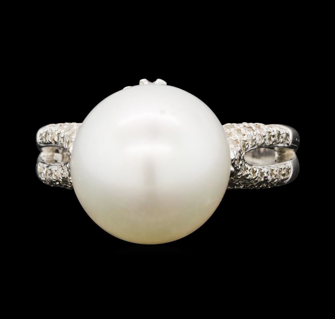 One electronically tested 18KT white gold lady's cast fashion ring with a split shank with a bright polish finish. The featured lady's ring has a scalloped gallery and a double shank measuring 3.70 millimeters wide. Identified with markings of '750'. Condition is new, good workmanship. Containing: One south sea cultured pearl, 12.2mm to 12.2mm in size. The pearl is white in color with a fair luster, round to near round, and lightly blemished. Graded in the setting. Twenty prong set round brilliant cut diamonds, measuring 1.30 - 1.20 x 0.78mm (depth est.) approximate total weight of 20 Stones = 0.15ct. Graded in the setting. Color H - I Clarity SI-1 to I-1 Cut Good Seventy-Eight prong set round brilliant cut diamonds, measuring 1.10 - 1.00 x 0.65mm (depth est.) approximate total weight of 78 Stones = 0.34ct. Graded in the setting. Color H - I Clarity SI-1 to I-1 Cut Good. Total Weight of Diamonds 0.49ct.. Total Weight of Ring 9.90gm GAS Appraised at $4,860.00.