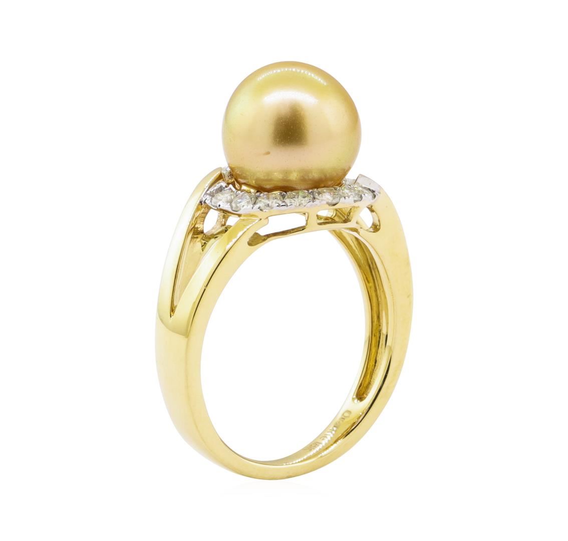 One polished, stamped, and tested 18K yellow gold ring mounted with: 1 genuine cultured South Sea Pearl, and 14 genuine round diamonds weighing approximately 0.44 carats. This item weighs 6.2 grams, condition is new, excellent workmanship. MAIN GEMSTONE Identity: South Sea Pearl Species: Cultured Pearl Shape: Round Measurements: 10 mm Body Color: Gold Overtone: Light Pink Surface Grade: Clean Luster: Excellent Refractive Index: 1.530 - 1.685 DR Birefringence: 0.15 Speci?c Gravity: 2.72 - 2.78 ADJACENT GEMSTONES ON RING Identity: Natural Diamond Shape: Round Cutting Style: Brilliant Cut Quantity: 14 Diamonds Average Diameter: 2 mm Total Weight: 0.44 carats Clarity Grade: S12 - all Color Grade: I- K Refractive Index: 2.418 Hardness: 10 SOUTH SEA PEARL: 10 mm TOTAL DIAMOND WEIGHT: 0.44 cts WEIGHT OF ITEM: 6.2 grams GOLD CONTENT: 18K Yellow Gold ESTIMATED RETAIL REPLACEMENT VALUE: USD $ 4,621.00