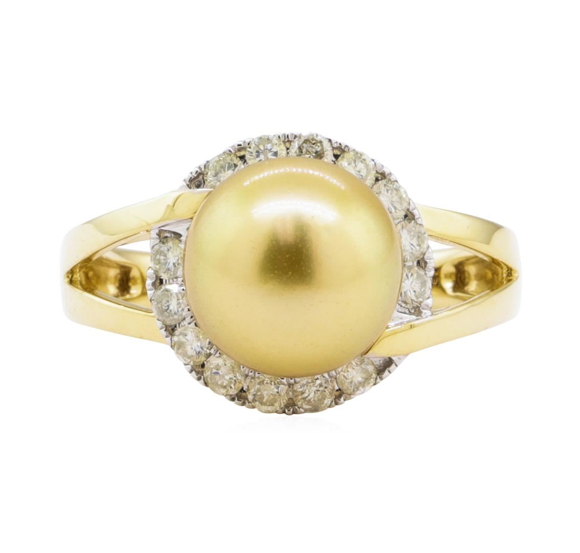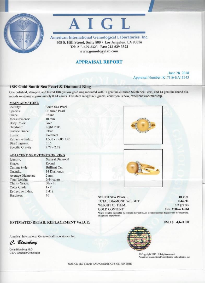 One polished, stamped, and tested 18K yellow gold ring mounted with: 1 genuine cultured South Sea Pearl, and 14 genuine round diamonds weighing approximately 0.44 carats. This item weighs 6.2 grams, condition is new, excellent workmanship. MAIN GEMSTONE Identity: South Sea Pearl Species: Cultured Pearl Shape: Round Measurements: 10 mm Body Color: Gold Overtone: Light Pink Surface Grade: Clean Luster: Excellent Refractive Index: 1.530 - 1.685 DR Birefringence: 0.15 Speci?c Gravity: 2.72 - 2.78 ADJACENT GEMSTONES ON RING Identity: Natural Diamond Shape: Round Cutting Style: Brilliant Cut Quantity: 14 Diamonds Average Diameter: 2 mm Total Weight: 0.44 carats Clarity Grade: S12 - all Color Grade: I- K Refractive Index: 2.418 Hardness: 10 SOUTH SEA PEARL: 10 mm TOTAL DIAMOND WEIGHT: 0.44 cts WEIGHT OF ITEM: 6.2 grams GOLD CONTENT: 18K Yellow Gold ESTIMATED RETAIL REPLACEMENT VALUE: USD $ 4,621.00