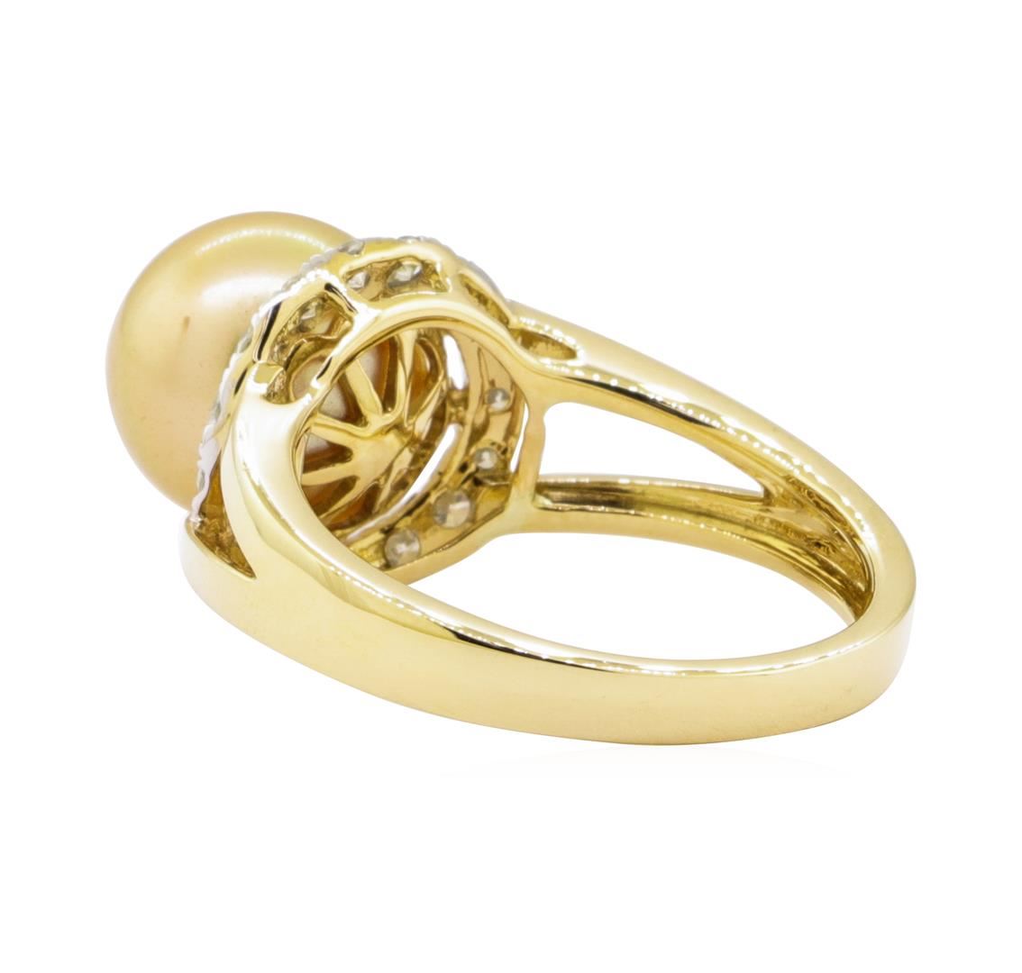 One polished, stamped, and tested 18K yellow gold ring mounted with: 1 genuine cultured South Sea Pearl, and 14 genuine round diamonds weighing approximately 0.44 carats. This item weighs 6.2 grams, condition is new, excellent workmanship. MAIN GEMSTONE Identity: South Sea Pearl Species: Cultured Pearl Shape: Round Measurements: 10 mm Body Color: Gold Overtone: Light Pink Surface Grade: Clean Luster: Excellent Refractive Index: 1.530 - 1.685 DR Birefringence: 0.15 Speci?c Gravity: 2.72 - 2.78 ADJACENT GEMSTONES ON RING Identity: Natural Diamond Shape: Round Cutting Style: Brilliant Cut Quantity: 14 Diamonds Average Diameter: 2 mm Total Weight: 0.44 carats Clarity Grade: S12 - all Color Grade: I- K Refractive Index: 2.418 Hardness: 10 SOUTH SEA PEARL: 10 mm TOTAL DIAMOND WEIGHT: 0.44 cts WEIGHT OF ITEM: 6.2 grams GOLD CONTENT: 18K Yellow Gold ESTIMATED RETAIL REPLACEMENT VALUE: USD $ 4,621.00