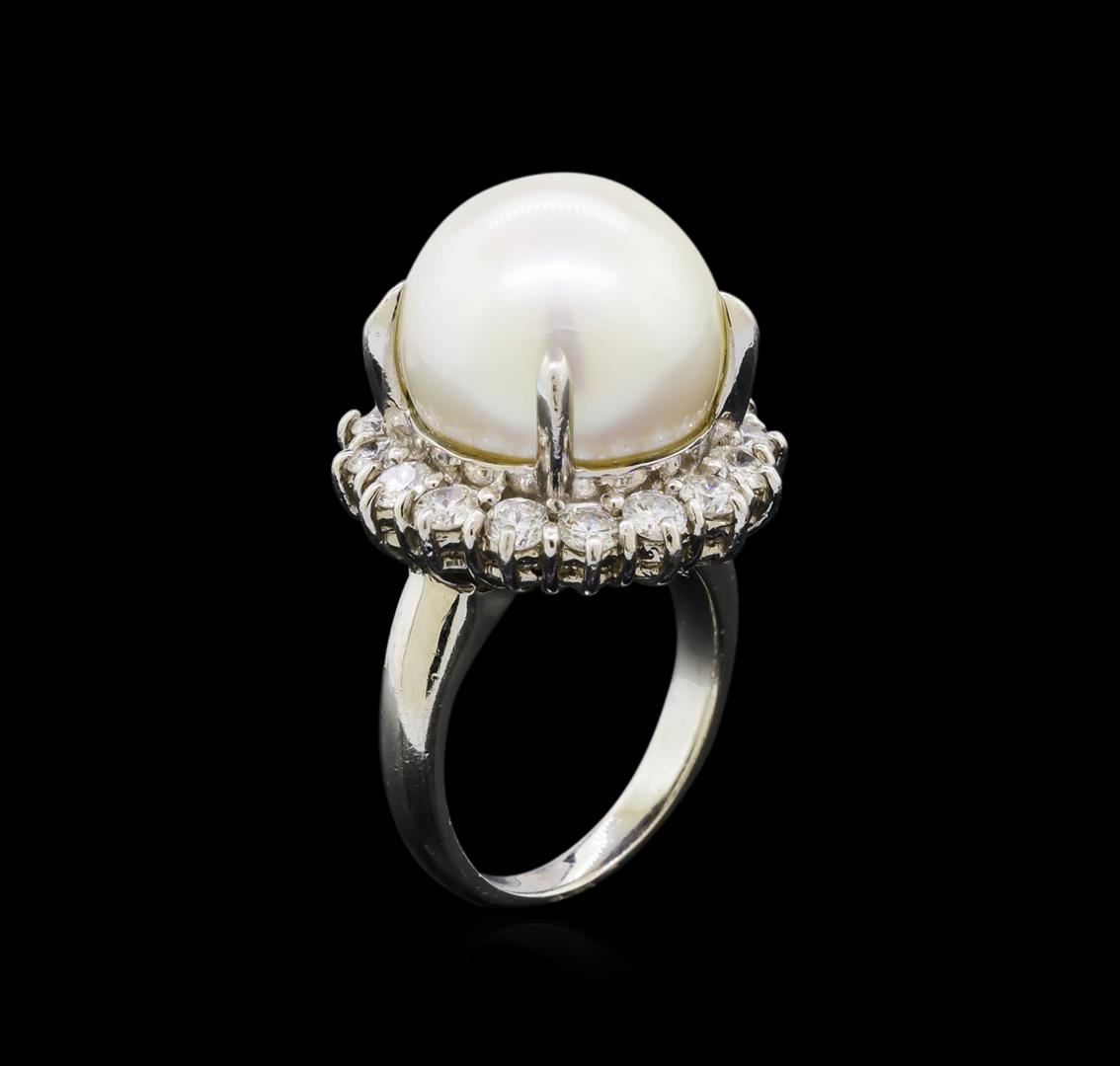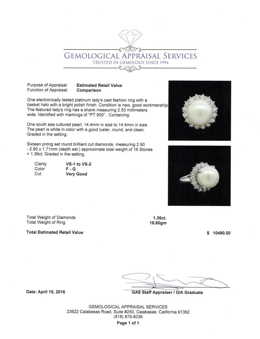 One electronically tested platinum lady's cast fashion ring with a basket halo with a bright polish finish. The featured lady's ring has a shank measuring 2.50 millimeters wide. Identified with markings of "PT 900". Condition is new, good workmanship. Containing: One south sea cultured pearl, 14.4mm in size to 14.4mm in size. The pearl is white in color with a good luster, round, and clean. Graded in the setting. Sixteen prong set round brilliant cut diamonds, measuring 2.90 - 2.80 x 1.71mm (depth est.) approximate total weight of 16 Stones = 1.36ct. Graded in the setting. Clarity: VS-1 to VS-2. Color: F - Very Good. Total Weight of Diamonds 1.36ct. Total Weight of Ring 18.60gm. GAS Appraised at $10,490.00.