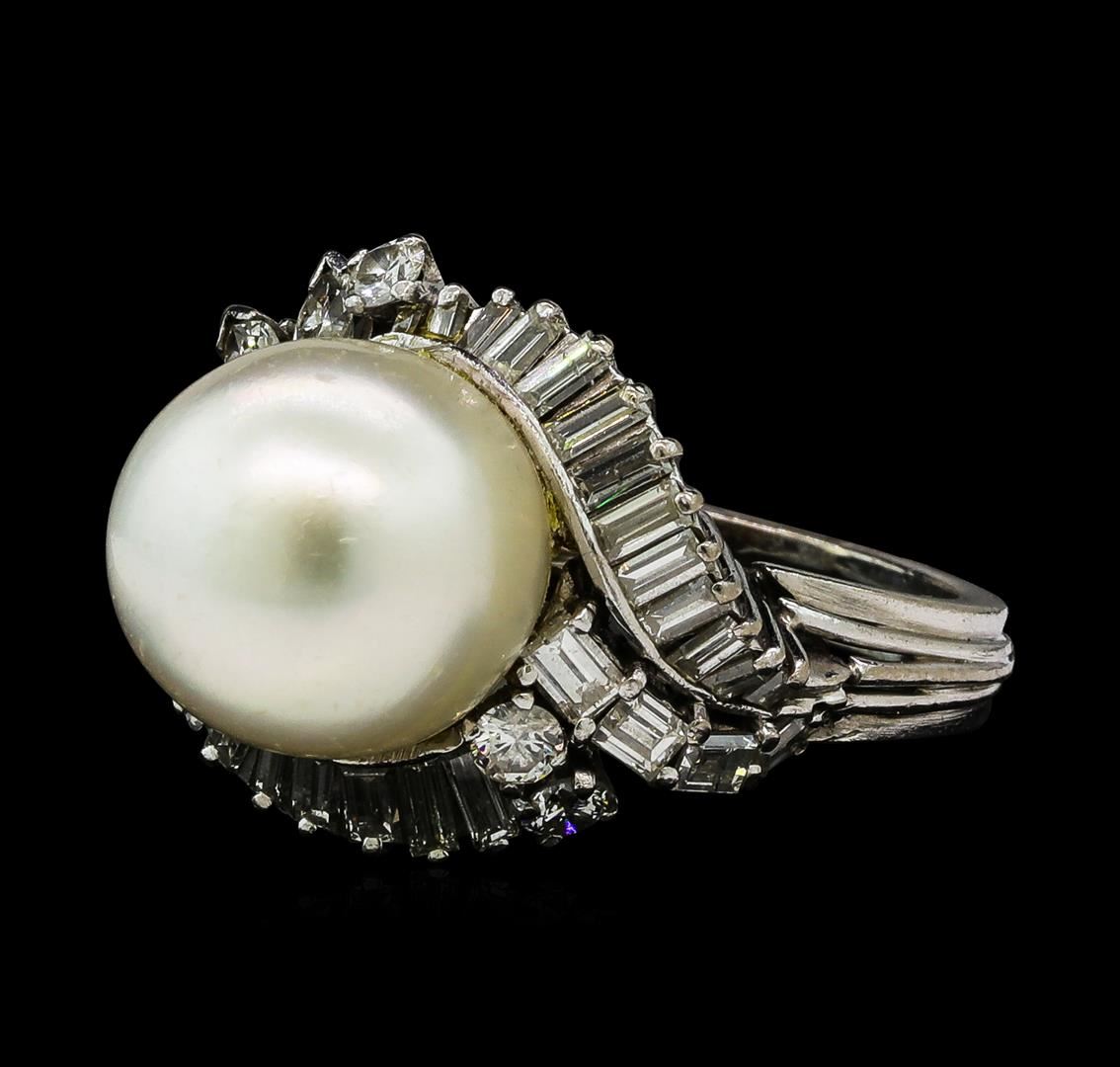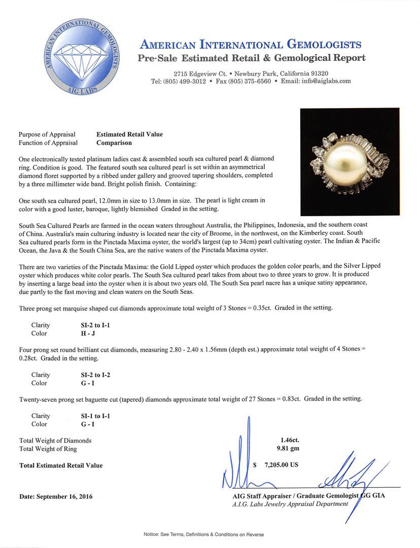 One electronically tested platinum ladies cast & assembled south sea cultured pearl & diamond ring. The featured south sea cultured pearl is set within an asymmetrical diamond floret supported by a ribbed under gallery and grooved tapering shoulders, completed by a three millimeter wide band. Bright polish finish. Condition is good. Containing: One south sea cultured pearl, 12.0mm in size to 13.0mm in size. The pearl is light cream in color with a good luster, baroque, lightly blemished Graded in the setting. South Sea Cultured Pearls are farmed in the ocean waters throughout Australia, the Philippines, Indonesia, and the southern coast of China. Australia's main culturing industry is located near the city of Broome, in the northwest, on the Kimberley coast. South Sea cultured pearls form in the Pinctada Maxima oyster, the world's largest (up to 34cm) pearl cultivating oyster. The Indian & Pacific Ocean, the Java & the South China Sea, are the native waters of the Pinctada Maxima oyster. There are two varieties of the Pinctada Maxima: the Gold Lipped oyster which produces the golden color pearls, and the Silver Lipped oyster which produces white color pearls. The South Sea cultured pearl takes from about two to three years to grow. It is produced by inserting a large bead into the oyster when it is about two years old. The South Sea pearl nacre has a unique satiny appearance, due partly to the fast moving and clean waters on the South Seas. Three prong set marquise shaped cut diamonds approximate total weight of 3 Stones = 0.35ct. Graded in the setting. Clarity SI-2 to I-1. Color: H - J Four prong set round brilliant cut diamonds, measuring 2.80 - 2.40 x 1.56mm (depth est.) approximate total weight of 4 Stones = 0.28ct. Graded in the setting. Clarity SI-2 to I-2. Color: G - I Twenty-Seven prong set baguette cut (tapered) diamonds approximate total weight of 27 Stones = 0.83ct. Graded in the setting. Clarity SI-1 to I-1. Color: G - I. Total Weight of Diamonds 1.46ct.. Total Weight of Ring 9.81gm. AIG Appraised at $7,205.00.