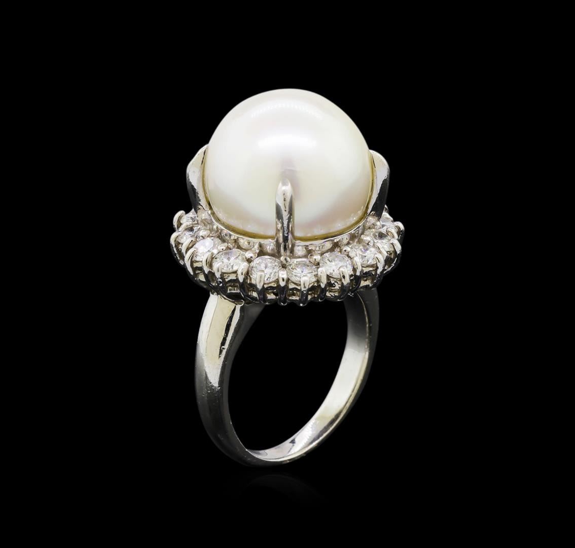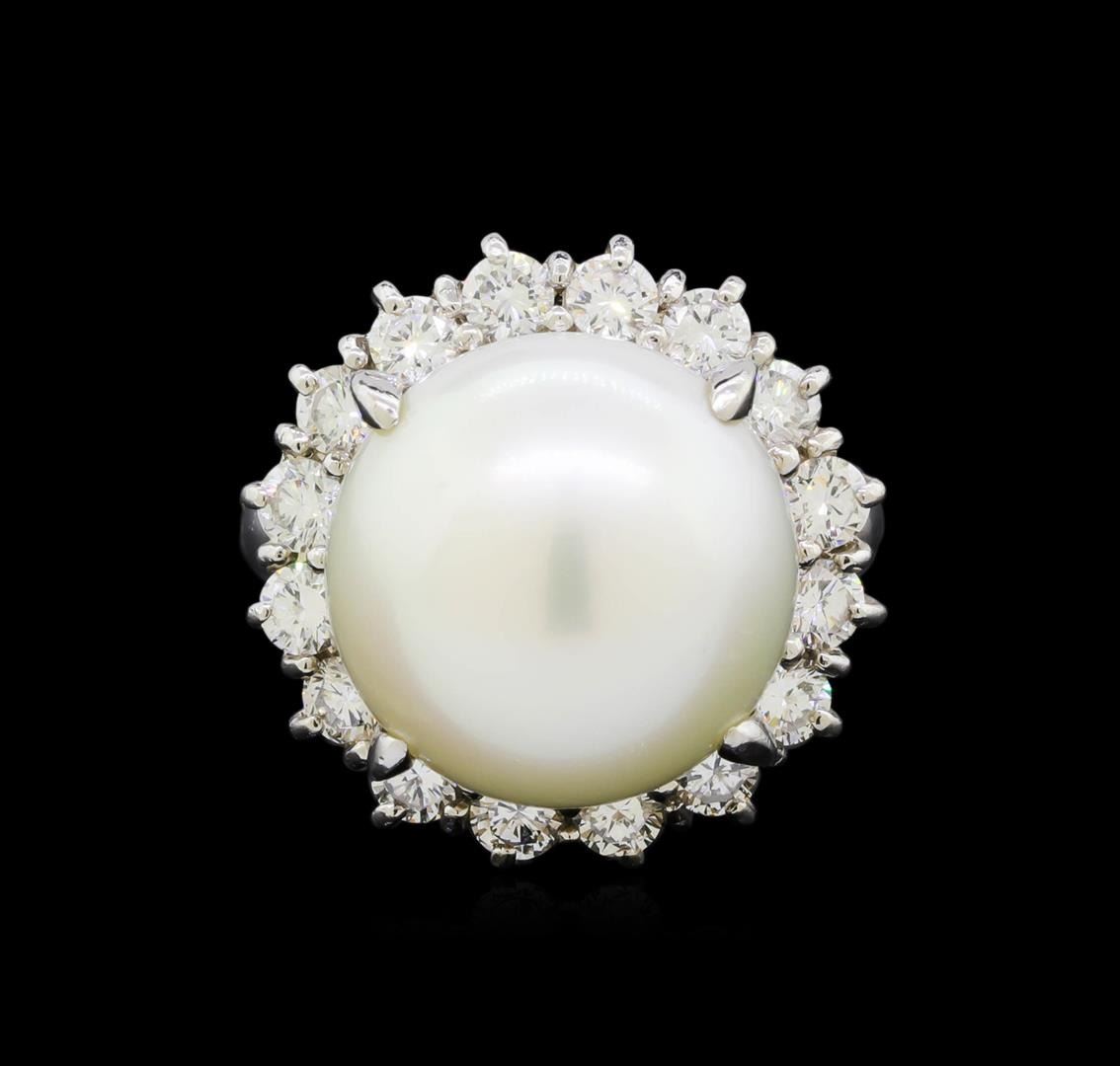 One electronically tested platinum lady's cast fashion ring with a basket halo with a bright polish finish. The featured lady's ring has a shank measuring 2.50 millimeters wide. Identified with markings of "PT 900". Condition is new, good workmanship. Containing: One south sea cultured pearl, 14.4mm in size to 14.4mm in size. The pearl is white in color with a good luster, round, and clean. Graded in the setting. Sixteen prong set round brilliant cut diamonds, measuring 2.90 - 2.80 x 1.71mm (depth est.) approximate total weight of 16 Stones = 1.36ct. Graded in the setting. Clarity: VS-1 to VS-2. Color: F - Very Good. Total Weight of Diamonds 1.36ct. Total Weight of Ring 18.60gm. GAS Appraised.