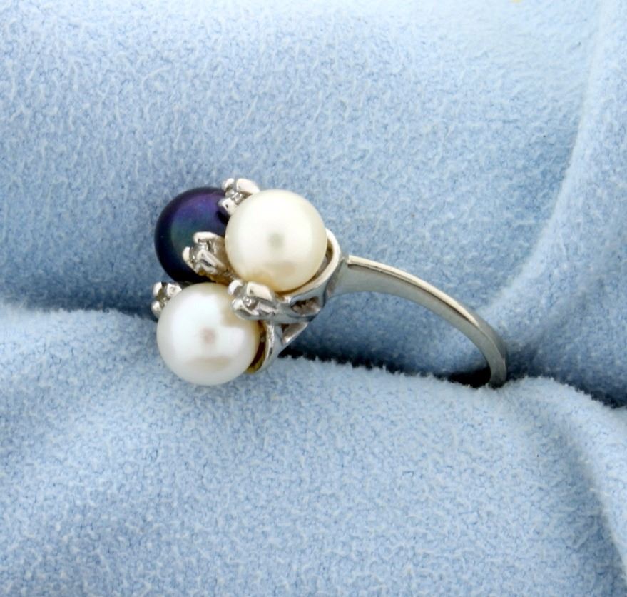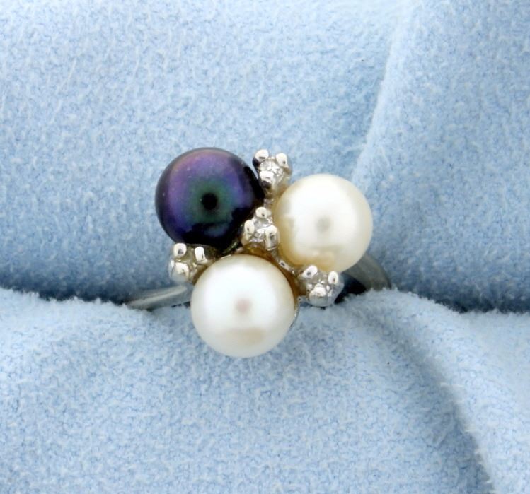 In 14K white gold it contains two 6mm white pearls and one 6mm black pearl and four .01ct diamonds. Size 3 3/4 4.0g