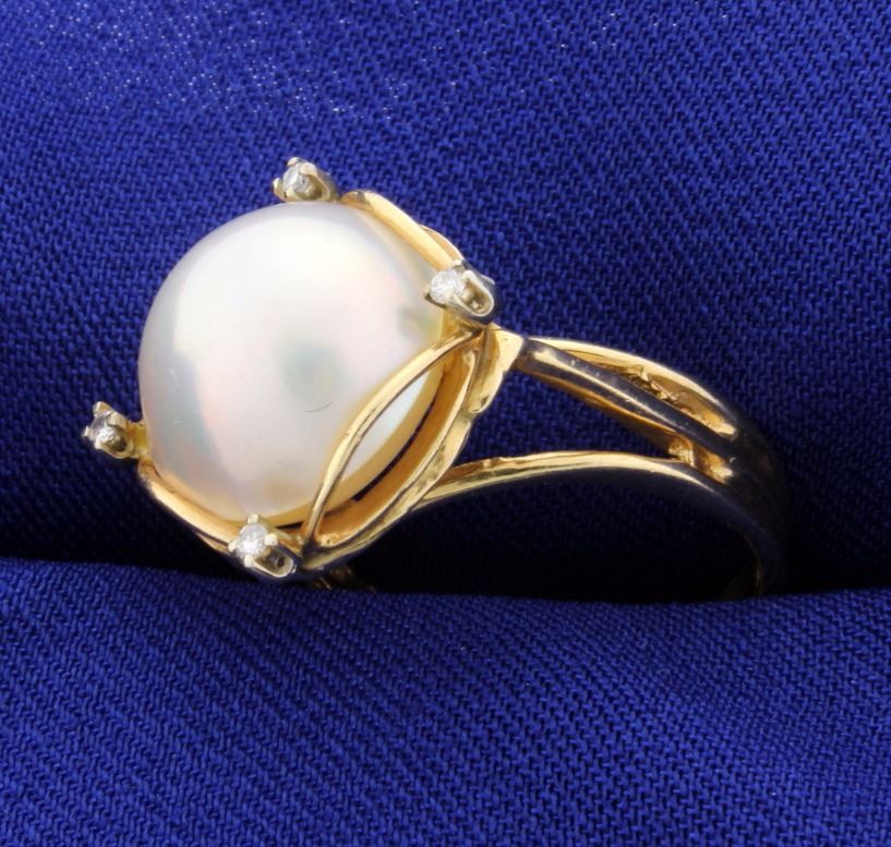 In 14K yellow gold there is a large 12mm pearl with fantastic luster & color! Also has four .01ct diamonds. Size 7 5.5g