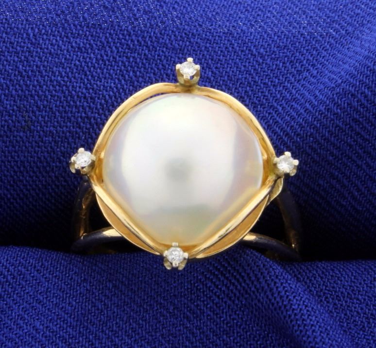 In 14K yellow gold there is a large 12mm pearl with fantastic luster & color! Also has four .01ct diamonds. Size 7 5.5g