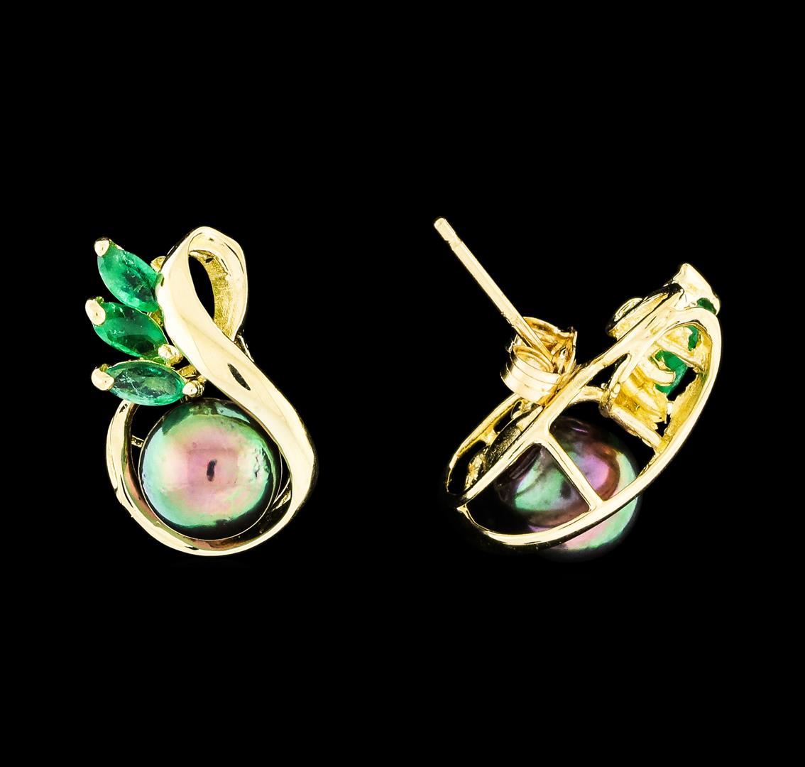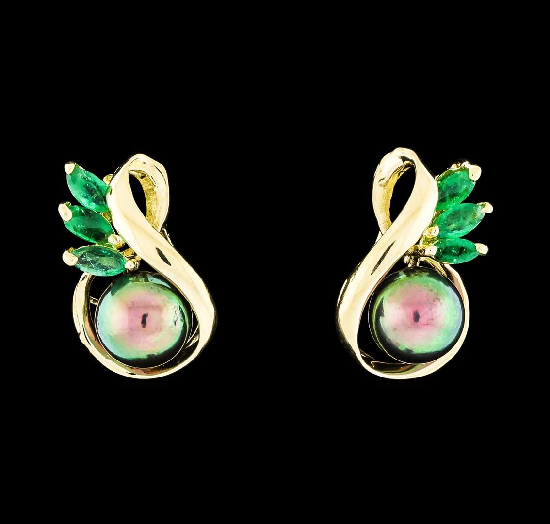One pair of Pearl and Emerald Earrings featuring: 14KT Yellow Gold with a total weight of 3.80 grams, Two Pearls, and Emeralds with a total weight of 0.30ctw,