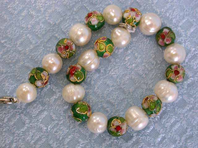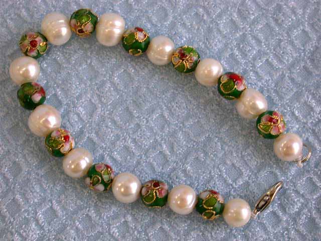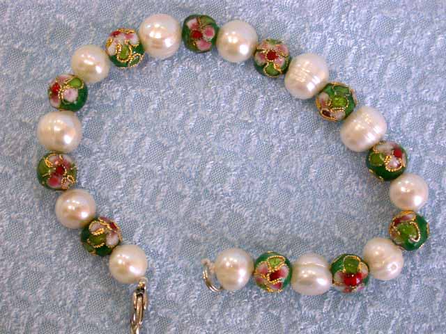 Hand Painted Enamel Beads & Fresh Water Pearl Bracelet approximately 7 inches long