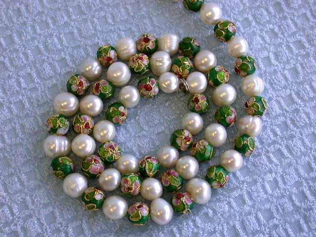 Pearl & Hand Painted Enamel Necklace approximately 18 inches long