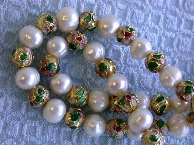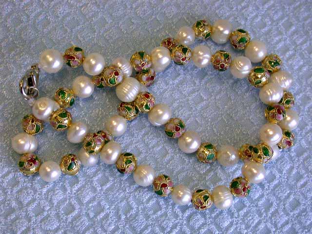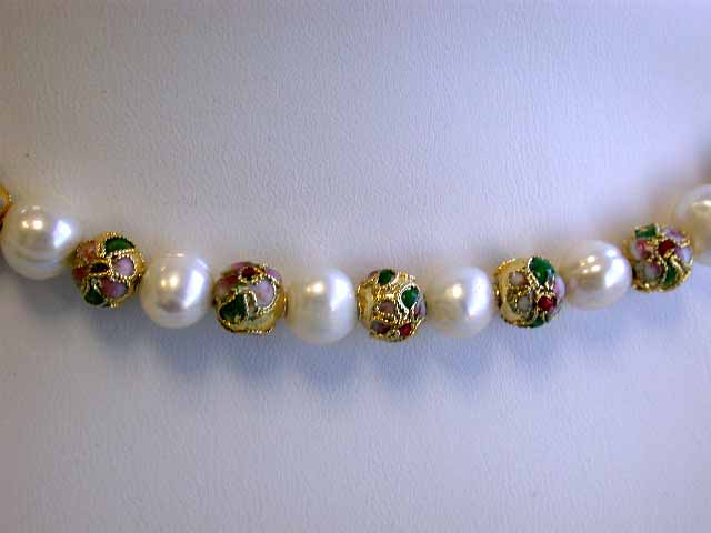 Pearl and Enamel Necklace about 7.5 mm bead size and approximately 18 inches long
