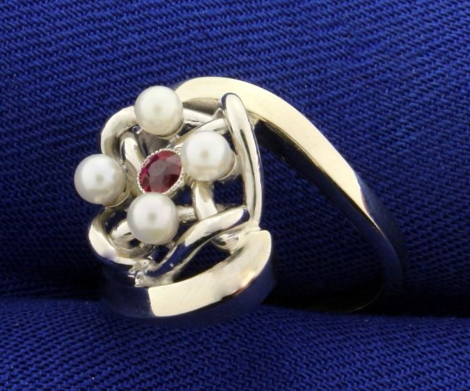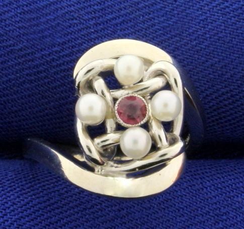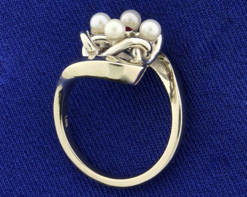 In 14K White Gold. Contains four 2.8mm Pearls with excellent white color and great luster. Also contains a natural 2.5mm round ruby gemstone with bright ruby red color and excellent clarity. Size 4 1/2. 6.5g