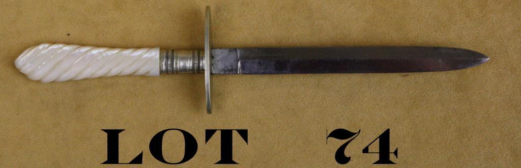 Pearl handled small dagger approx. 8” overall with an approx. 4-1/2” blade marked “NON XLL, Joseph Allen & Sons, Sheffield, England”. This knife is in overall good condition showing a turned iridescent pearlgrip with oval guard and overall good blade with some slight erosion spots. Est.: $100-$200.