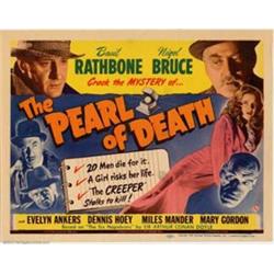 Pearl of Death (Universal, 1944). Title Lobby Card (11" X 14"). Based on Doyle's story " The Six Napoleons", this Sherlock Holmes mystery was the debut of Rondo Hatton as the "Creeper". The paper for the Rathbone-Sherlock Holmes' movies have been rapidly escalating. Very Fine. Important notice: We expect to be auctioning lots at the rate of 200-250 per hour. Sometimes eBay Premier live bid software cannot keep up with that pace, so we strongly recommend that you place a realistic proxy bid now as insurance to avoid disappointment. Also please note that all Heritage/CAA lots purchased through eBay Premier carry a 20% Buyer's Premium.