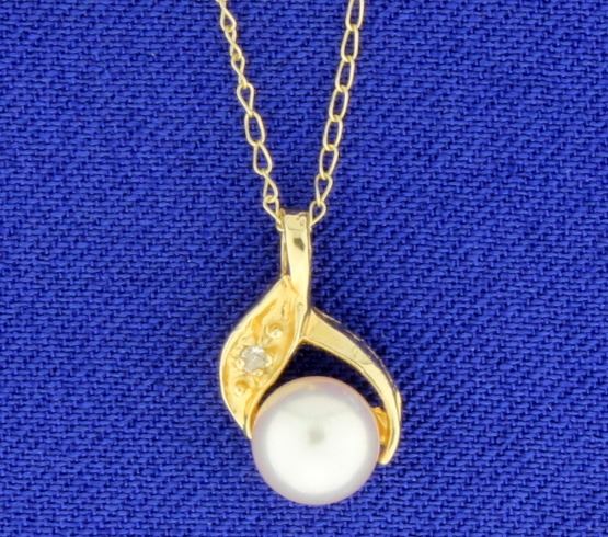 In 14K yellow gold, the pendant is 1/2 inch long and contains a 6mm pearl and a .01ct diamond. Pendant is on a 17 inch chain.      1.3g