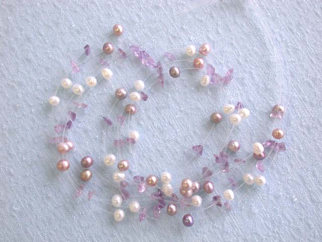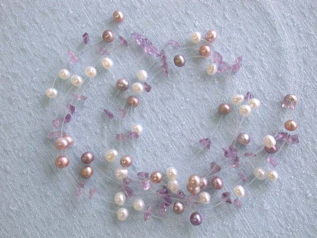 Pearls and Amethyst Necklace with Silver Clasp. The necklace has 5 strands of Pearls and Amethyst with Length of approximately 18 inches long.