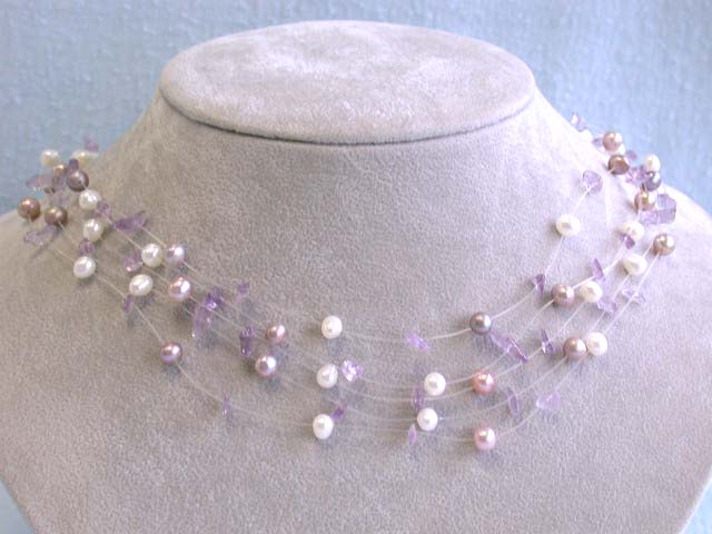 Pearls and Amethyst Necklace with Silver Clasp. The necklace has 5 strands of Pearls and Amethyst with Length of approximately 18 inches long.