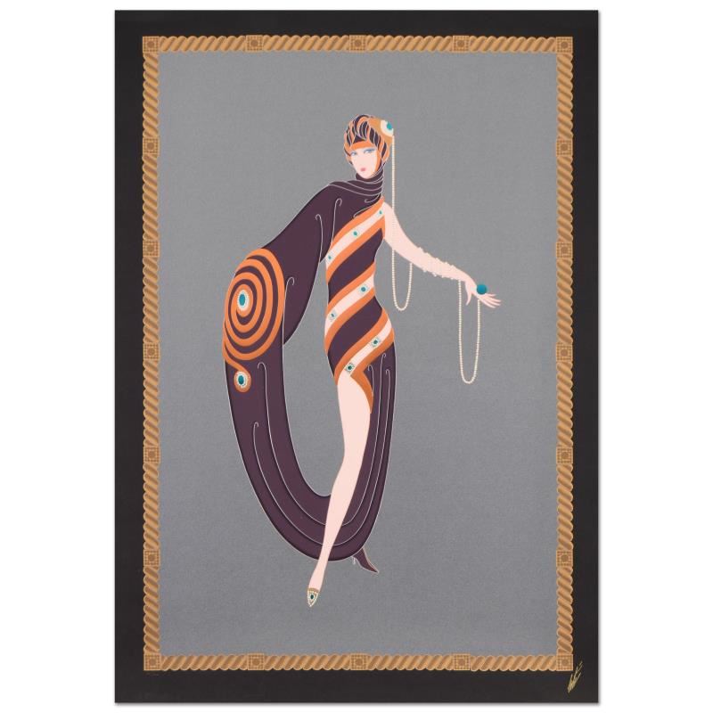 "Pearls and Emeralds" is a limited edition serigraph on paper by Erte (1892-1990), numbered and estate signed. Includes Certificate of Authenticity. Measures approx. 29.5" x 42.5" (border), 27" x 29" (image). Due to the age of this piece and the delicate nature of the paper it may have some slight imperfections.