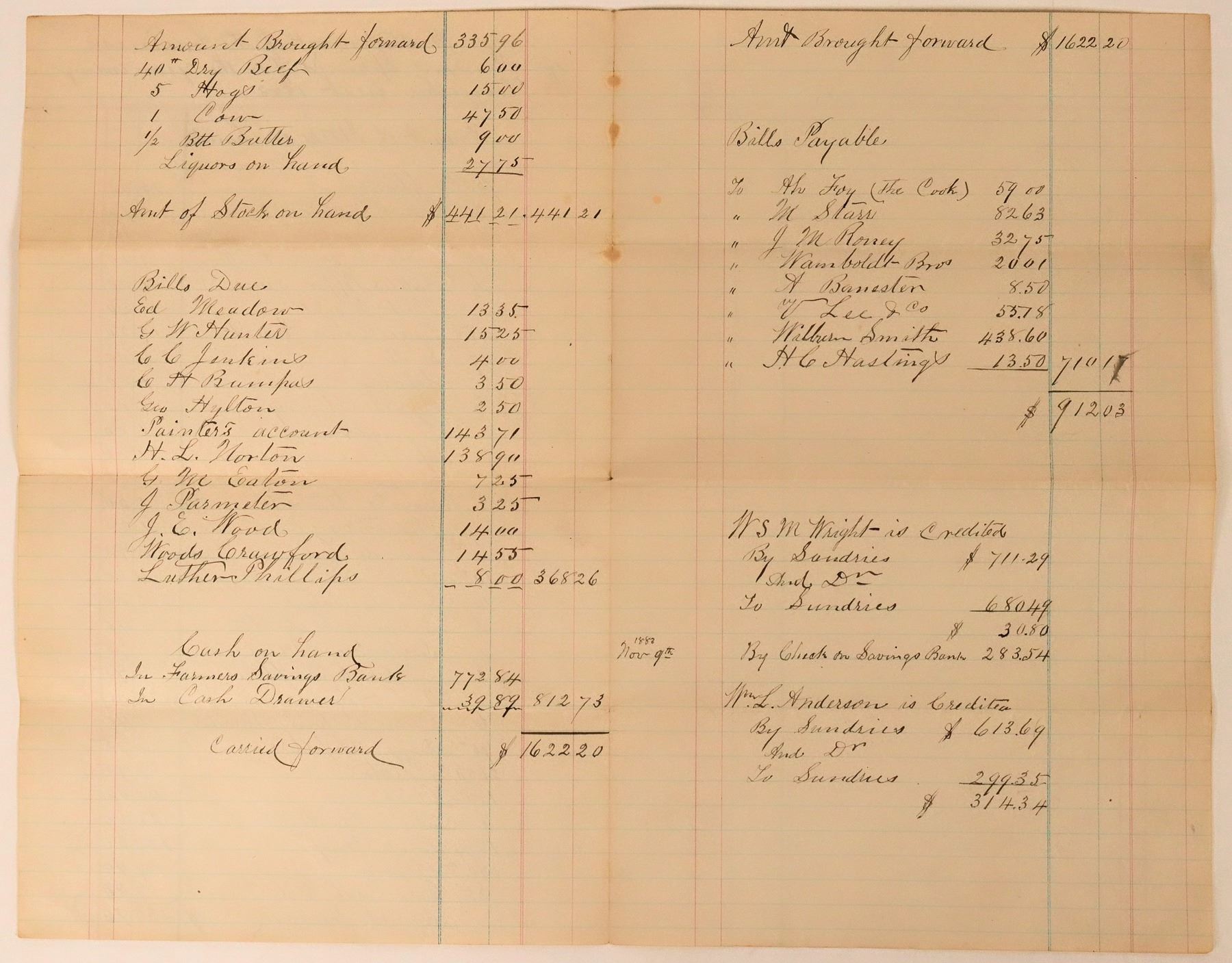 Ledger sheet for the business of Pearson Springs for the year ending November 1st, 1883. Inside list bills due to numerous merchants like Wamboldt Bros., C. Lec & Co., HC Hastings, and Wilbur Smith. This was originally thought to be related to the Pearson Springs, located outside of Bodie, California and tied to soda bottles, but the merchants are from Lakeport. Thus, it is likely not related to the Pearson's Soda Works. Pearson Springs was a resort and springs located 14 miles from Lakeport, Lake County, open May to October. (See: Tourists' Illustrated Guide to the Celebrated Summer and Winter Resorts of California, 1883) 12.25 x 8"