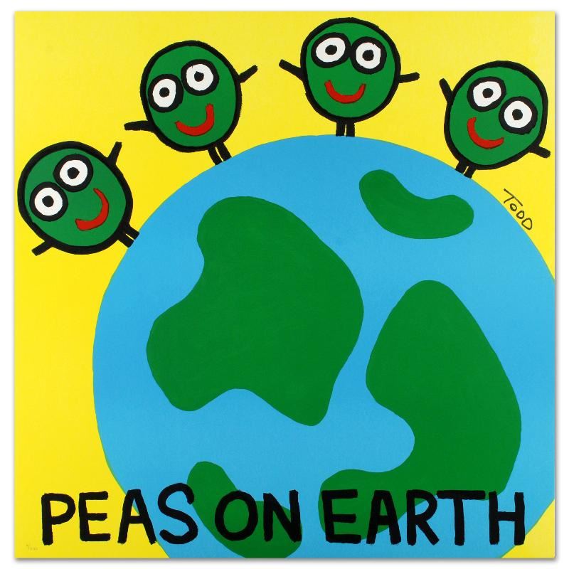Pop artist Todd Goldman is known all across the globe for his whip-smart and wickedly funny puns and pictures! "Peas on Earth" is a limited edition lithograph on paper, numbered and hand signed by Todd. Includes Certificate of Authenticity! Measures approx. 32" x 32" (no border).